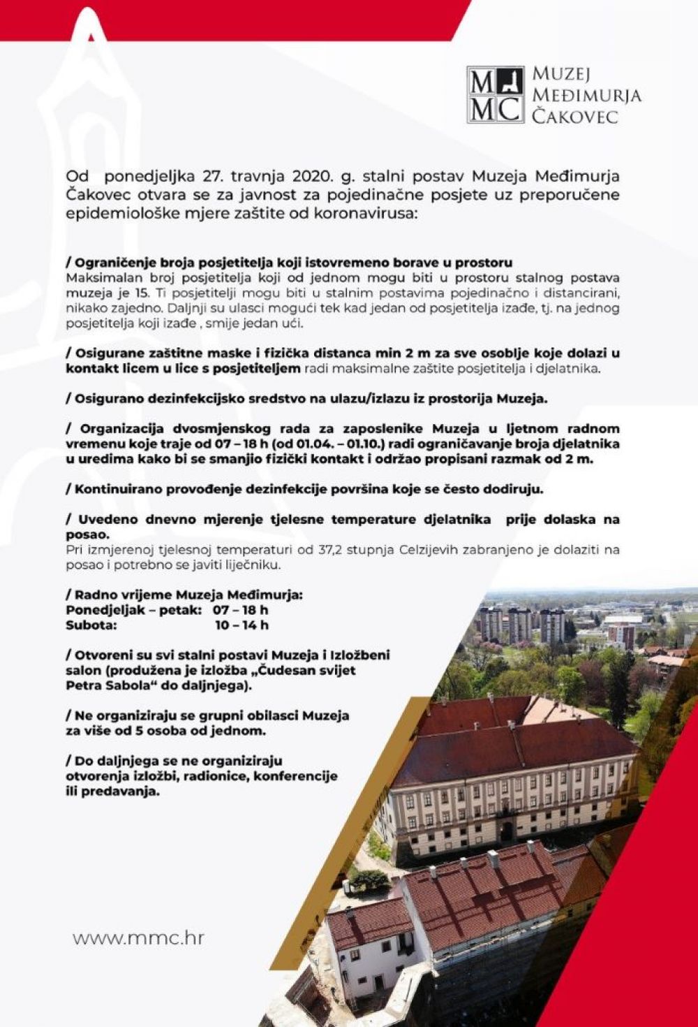 Od ponedjeljka 27. travnja 2020. g. stalni postav Muzeja Međimurja Čakovec otvara se za javnost za pojedinačne posjete uz preporučene epidemiološke mjere zaštite od koronavirusa: