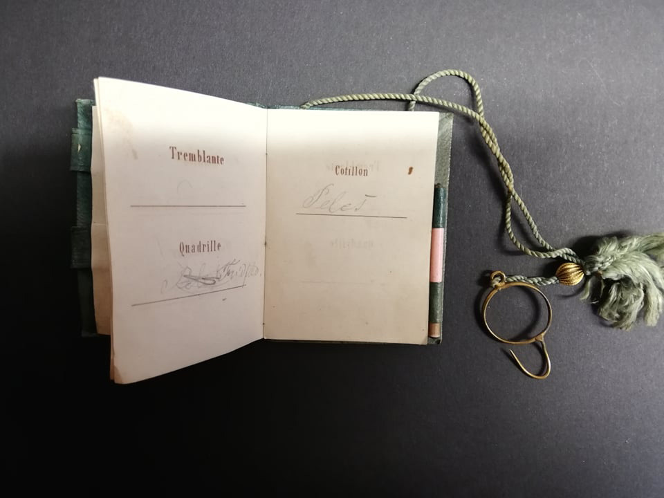 Predmet dana odraz je tadašnje kulture ponašanja, profinjenosti i elegancije te govori o nekadašnjem društvenom statusu. Riječ je o manjoj uvezenoj ženskoj plesnoj knjižici čije su korice izrađene od kože zelene boje, zlatnih uokvirenih rubova. Odmah na prvu možemo primjetiti da bogatstvo kulture nije nedostajalo kod materijalne izrade plesne knjižice, a razmišljanje o estetici kulture primjetno je i na njenoj funkcionalnosti. Na knjižicu je pričvršćen isprepleteni zeleni konac s kovrčavim resom te je upotpunjen metalnim prstenom pri vrhu što ukazuje na namjenu nošenja predmeta oko zapešća i prsta. Na prednjoj strani knjižice u sredini je reljefno izrađen metalni ukras s nekoliko isprepletenih simbola - sidro, lopata, kaciga s dvije ptičje glave te štap s dvije isprepletene zmije. U stražnju koricu umetnuta je minijaturna roza pisaljka. Knjižica sadrži natpise nekoliko vrsta plesova zajedno s imenima partnera s kojima je dama imala čast oplesati određeni ples.