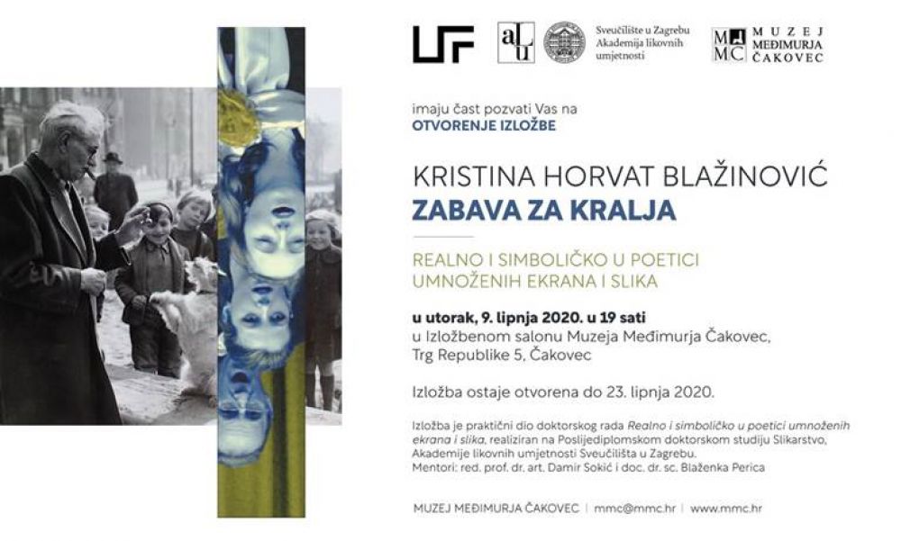 U izložbenom salonu MMČ, 9. lipnja, u 19 sat,i otvara se izložba „Zabava za kralja“, autorice Kristine Horvat Blažinović.Izložba je praktični dio doktorskog rada akademske slikarice Kristine Horvat Blažinović, magistrice umjetnosti, u okviru doktorskog studija na Akademiji likovnih umjetnosti u Zagrebu. Naslov disertacije je: „Realno i simboličko u poetici umnoženih ekrana i slika“. Mentori: red.prof.art. Damir Sokić i doc.dr.sc. Blaženka Perica.