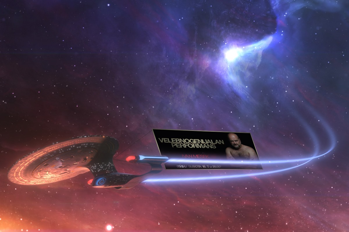 A s pandemijom COVID-19 to je, zbog izolacije i distance koja nam je nametnuta, postalo još aktualnije.Pravi performance Mesek je u skladu s epidemiološkim mjerama zapravo prezentirao virtualno, jer je plakat za događanje objavljivao je na facebooku te mu pridao velebnogenijalnost vještim korištenjem montaže.