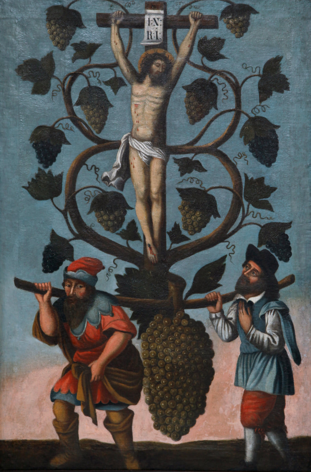 Dva snažna nosača uzdigla su divovski grozd obješen o motku koju pridržavaju ramenima (Kada stigoše u Dolinu Eškol, odrezaše ondje lozu s grozdom i ponesoše ga, udvoje, na motku...). Kanaanski grozd smatra se prefiguracijom Krista na križu, njegove patnje, prolivene krvi. Ovdje je prikazan Raspeti na križu među krupnim viticama vinove loze.