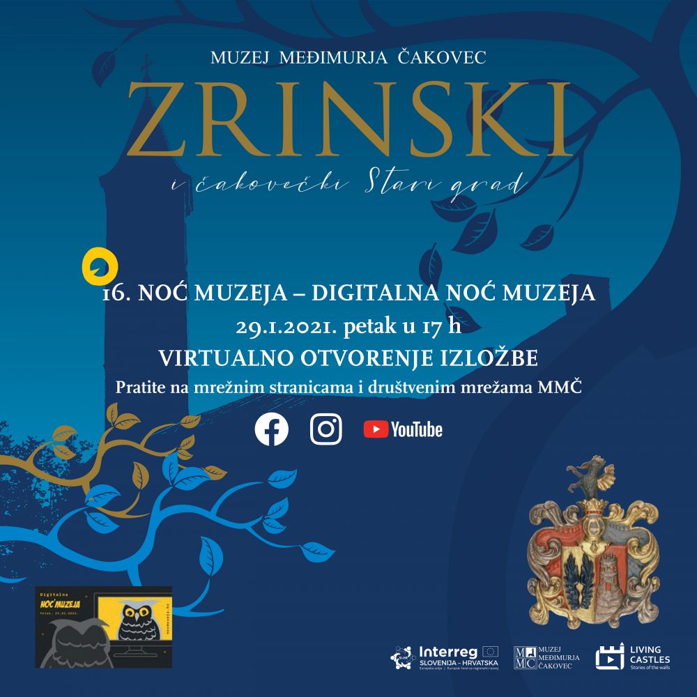 - Ove godine Noć muzeja slavimo uz virtualno otvorenje izložbe „Zrinski i čakovečki Stari grad“. Prema odluci Hrvatskog muzejskog društva kao glavnog organizatora manifestacije u Hrvatskoj, u 2021. godini 16. Noć muzeja održat će se kao digitalna noć muzeja. Ova odluka uvjetovana je epidemiološkim uvjetima vezanim uz pandemiju virusa SARS CoV-2. Ovakav način održavanja manifestacije sukladan je funkcioniranju muzeja u uvjetima globalne svjetske krize, u okolnostima kada se većina kulturnih događanja odgađa ili potpuno seli u digitalnu kanale komuniciranja i prijenosa sadržaja. Na ovogodišnjoj Noći muzeja omogućit ćemo muzejskoj publici da virtualno uživa u pripremljenim događanjima.