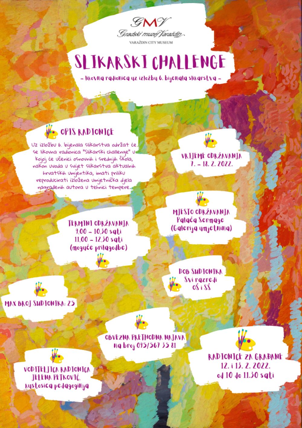 GMV organizira izložbu 6. Bijenale slikarstva, u suradnji s Hrvatskim društvom likovnih umjetnika, a uz izložbu organiziraju se i likovne radionice pod nazivom „Slikarski challenge“, u kojima će svoju kreativnost imati prilike otkriti i izraziti i odrasli. Pod voditeljstvom kustosice pedagoginje u GMV-u Jelene Petković sudionici će kroz razgled izložbenog postava doznati općenite informacije o slikarstvu i izloženim djelima aktualnih hrvatskih slikara, a u praktičnom dijelu okušati se u reproduciranju slika u tehnici tempere nagrađenih autora s 6. Bijenala slikarstva. Radionice za odrasle održavaju se 12. i 13. veljače (subota i nedjelja) od 10 do 11.30 sati, a za sudjelovanje je obvezna prethodna telefonska prijava na broj 095 567 3581. Cijena sudjelovanja je 30,00 kuna.