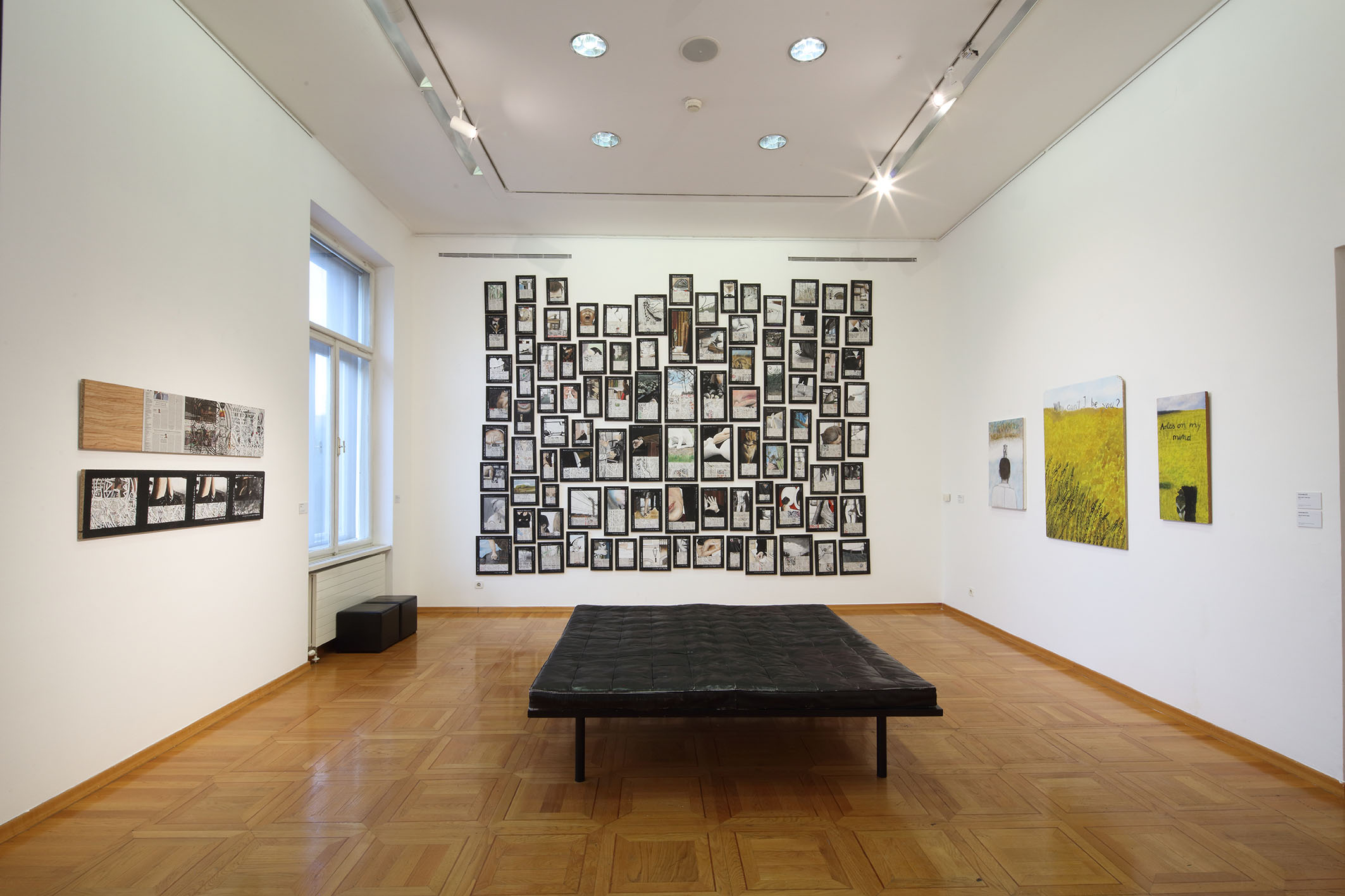 Izložba u Nacionalnom muzeju moderne umjetnosti u skladu s proklamiranim programskim fokusom na stvaralački čin kojem je cilj umjetnički objekt izveden tradicionalnom likovnom disciplinom, predstavlja mahom Pavelićeve slike uz nekoliko objekata koji publici trebaju signalizirati postojanje njegove drugačije umjetničke prakse. Stoga ćemo u opisu izložbe krenuti od tri izložena objekta. Jedan od njih je već spomenuta i interpretirana Zlatna prečka iz 2010. godine. Uz nju je predstavljena i Kunst – Dunst mašina (2007. – 2010.) koju kao pronađeni objekt, u naravi stroj za razvlačenje tijesta, preuređuje dodajući na valjke brusni papir s napisanom riječi Kunst (njem. umjetnost) na gornjem i Dunst (njem. izmaglica) na donjem valjku. To je izvrstan primjer Pavelićeve sklonosti prema poigravanju riječima i anagramima koje, računajući na efekt paradoksa, često koristi u svojim radovima, a nadasve na slikama. Pokretanjem stroja umjetnost i kreativna izmaglica se uz struganje brusnog papira s otporom taru jedna o drugu, s više nego jasnom porukom o mutnim situacijama i lošem sustavu vrednovanja unutar kulturnog sustava koji određuje vrijednosnu hijerarhiju umjetničkog stvaralaštva. Treći predstavljeni ne-slikarski rad kratki je videozapis iz 2007. godine koji prikazuje zabat slavne Likovne akademije u Düsseldorfu s montažom dodanim zvukom udarca nogom koji je Pavelić snimio tijekom performansa Kuća umjetnika izvedenog u Meštrovićevu paviljonu 2003. godine. Udarac na videu odjekne poput pucnja na koji zabat Akademije poskoči, da bi se potom smirio u početnom stanju. Ironični naziv Jučer, danas, sutra ukazuje na Pavelićevo viđenje različitosti u funkcioniranju dvaju umjetničkih sustava.