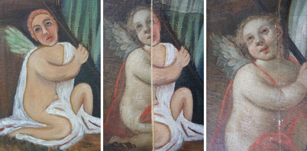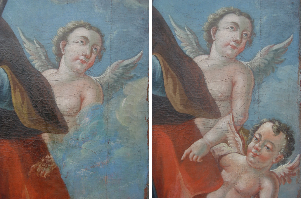 Kako su, prije nekoliko godina, talijanski restauratori otkrili lice nečastivog skriveno u oblacima na Giottovoj fresci u bazilici sv. Franje u Assissi-u tako je i u ovom našem primjeru oltarne pale sv. Roka, 18. st., iz istoimene franjevačke crkve u Novom selu Rok u Međimurju pronađen preslikani, ni manje ni više već prelijepi osmi anđeo adorant među oblacima onkraj sv. Roka. Na taj smo način postali svjedoci otkrivanja namjerno skrivenog lica slike i pretvaranja nedostupnog, skrivenog i tajnog u javno i prezentno, ali smo tim postupkom zapostavili slikarevu volju i demistificirali sliku. Takovo autentično, individualno htijenje slikara i postupak sakrivanja bili su najvjerojatnije izazvani intencijom podešavanja kompozicionog ekvilibrija.