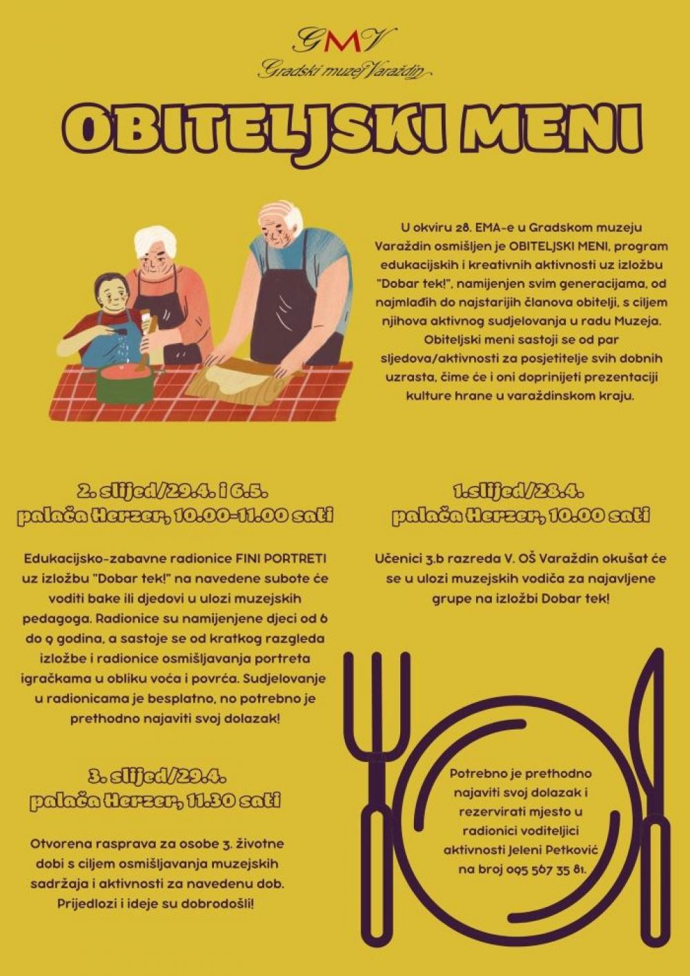 U okviru 28. EMA-e u Gradskom muzeju Varaždin osmišljen je OBITELJSKI MENI, program edukacijskih i kreativnih aktivnosti uz izložbu Dobar tek!, namijenjen svim generacijama, od najmlađih do najstarijih članova obitelji, s ciljem njihova aktivnog sudjelovanja u radu Muzeja.