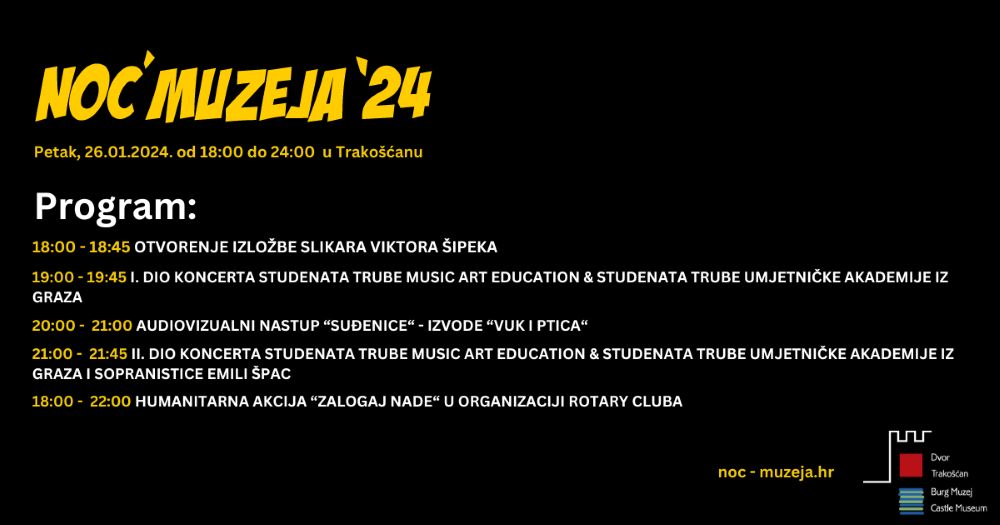 Tako će se u 18:00 sati održati otvorenje izložbe Viktora Šipeka nakon čega će studenti trube Music Art Educationa zajedno sa studentima Umjetničke akademije iz Graza održati koncert trube. U 20 sati održati će se audiovizualni performans "Suđenice" u izvedbi "Vuka" i "Ptice", odnosno Domagoja Vukovića i Ane Salopek. Audiovizualni performans svojim inovativnim i suvremenim pristupom narodnoj predaji o vilama , kao i zanimanjem i proučavanjem staroslavenske mitologije, želi doprijeti do nove publike, što je i tema Noći muzeja 2024. Kao produkt promišljanja i komuniciranja o ulozi vila, autori će uživo demonstrirati svoju međusobnu komunikaciju, introspekciju i komunikaciju s narodnom predajom i mitologijom. Spajajući književnost, glazbu i likovnost autori ulaze u mitološki i arhetipski svijet narodnih priča živeći, popularizirajući i njegujući nematerijalnu kulturnu baštinu. Nakon toga održati će se i drugi dio koncerta trube , a tijekom cijele će večeri Rotary Club Trakošćan održavati i svoju humanitarnu akciju "Zalogaj nade".