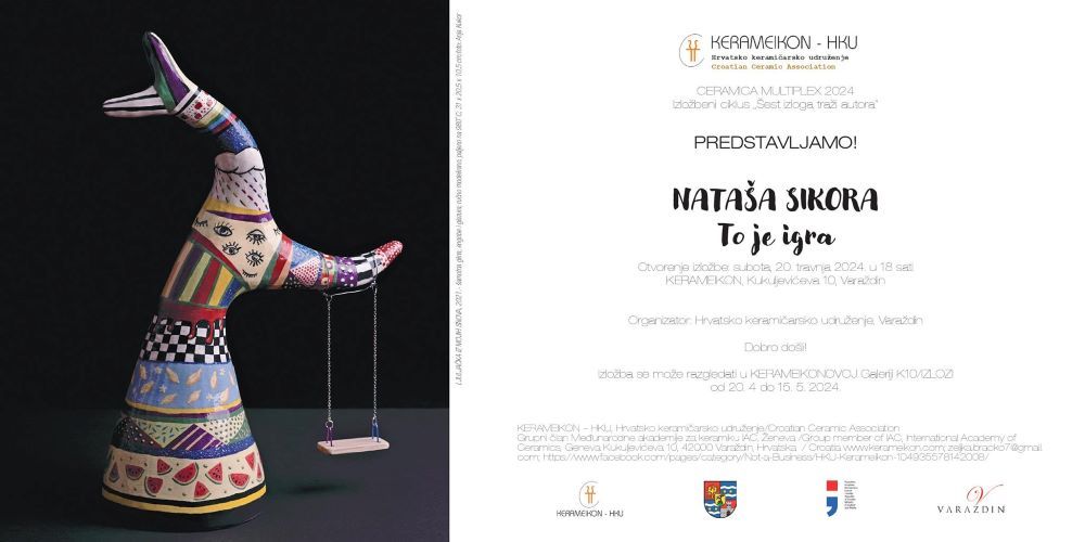 - U početku, to je bila samo dječja igra. Kad smo bili mali, grijali smo plastelin svojim ručicama, da omekša i postane podatan za oblikovanje. Sada moje ruke imaju glinu. Glina me vodi u svijet mašte, pruža mi veselje koje prenosim na svoje skulpture. One su šarene i zaigrane, ponekad i šaljive, Igra me vodi do istraživanja novih materijala, tehnika paljenja i ukrašavanja keramike. Uvijek mi je cilj svojim radovima prikazati kvalitetu i maštovitost. I na kraju, to je igra, koja inspirira. - Kaže Nataša Sikora, umjetnica čija će se izložba pod naslovom To je igra, od 20. travnja do 15. svibnja moći razgledati u varaždinskoj galeriji K10.