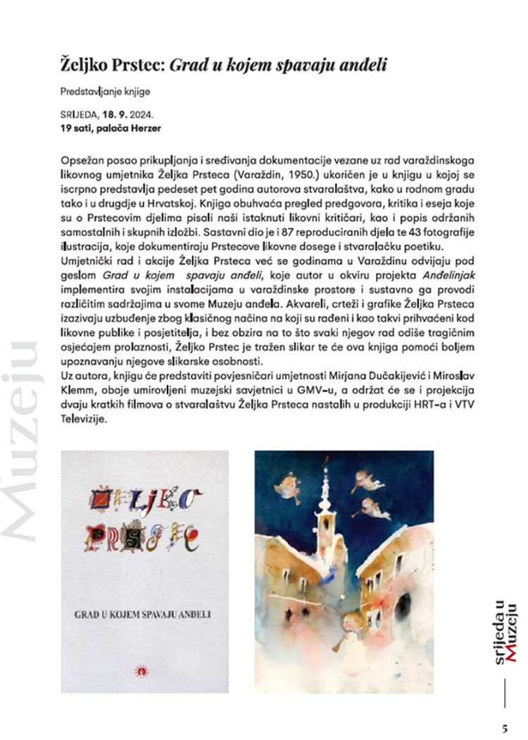 Poznati varaždinski umjetnik, Željko Prstec, slikar anđela i začetnik Muzeja Anđela, autor instalacije Anđelinjak, zaslužan i za moto Varaždin - Grad u kojem anđeli spavaju, poziva sve zaineresirane na predstavljanje knjige eseja, predgovora, kritika na njegov polustoljetni slikarski rad pod naslovom "Željko Prstec - Grad u kojem spavaju anđeli." Promocija knjige je 18. rujna u 19 sati u palači Herzer GMV-a.