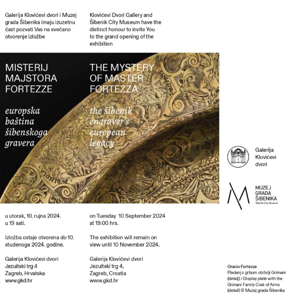 Galerija Klovićevi dvori i Muzej grada Šibenika pozivaju na izložbu Misterij majstora Fortezze – Europska baština šibenskoga gravera. Otvara se u utorak 10. rujna u 19 sati, u Galeriji Klovićevi dvori, Jezuitski trg 4, Zagreb,  i može razgledati do 10. studenoga.