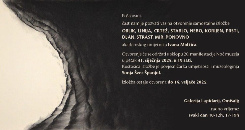 U petak 31. siječnja 2025. u sklopu 20. manifestacije Noć muzeja u galeriji Lapidarij u Omišlju održat će se program koji obuhvaća niz raznolikih aktivnosti namijenjenih svim generacijama krenuvši od samostalne izložbe "Oblik, linija, crtež, stablo, nebo, korijen, prsti, dlan, strast, mir, ponovo" eminentnog i svestranog akademskog umjetnika Ivana Midžića koja ukazuje na često nevidljiv, kompleksan, ali i bogat i raznolik rad umjetnika te pruža vizualno, umjetničko i edukativno iskustvo koje će dodatno biti prošireno zanimljivim i bogatim informacijama o radu samog autora kroz razgovor s umjetnikom u kojem ćemo se dotaknuti i njegovog radnog okruženja, izazova s kojima se susreće, stvaralačkog procesa te svih segmenata djelovanja koji prethode realizaciji same izložbe, a javnost ćemo upoznati s relevantnim informacijama što predstavljanje vlastitog rada unutar muzeja ili galerije predstavlja za umjetnika, kakav utjecaj imaju izložbe na publiku te kako niz nevidljivih poslova koje obavljaju organizatori i autori izložbi doprinosi zaokruženom iskustvu koje posjetitelj doživljava prilikom konzumacije sadržaja koje lokalni muzeji i galerije predstavljaju javnosti. Za najmlađe će biti organizirana posebna likovna igra koja spaja aktualnu izložbu s bogatim kulturnim i prirodnim nasljeđem Omišlja, a svi posjetitelji bit će pozvani ispuniti anonimnu anketu o važnosti i zastupljenosti umjetnosti u našim svakodnevnim životima.