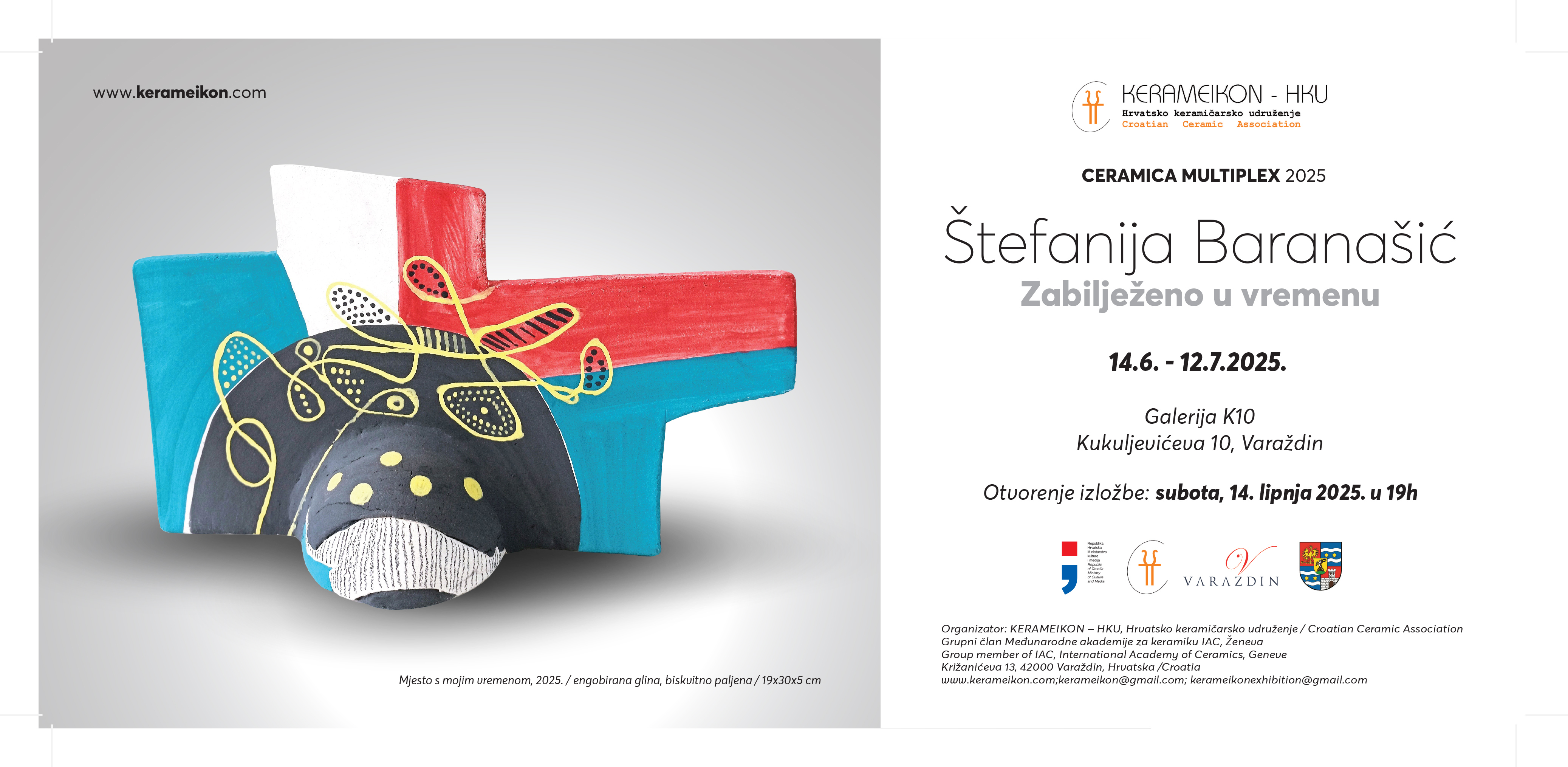 U galeriji K10 u Varaždinu u okviru ciklusa CERAMICA MULTIPLEX 2025 ove subote Kerameikon predstavlja Šefaniju Baranašić koja koje svoju izložbu kojom slavi tri desetljeća javnog umjetničkog djelovanja naslovila - Zabilježeno u vremenu. Otvorenje izložbe: subota, 14. lipnja, u 19 sati.