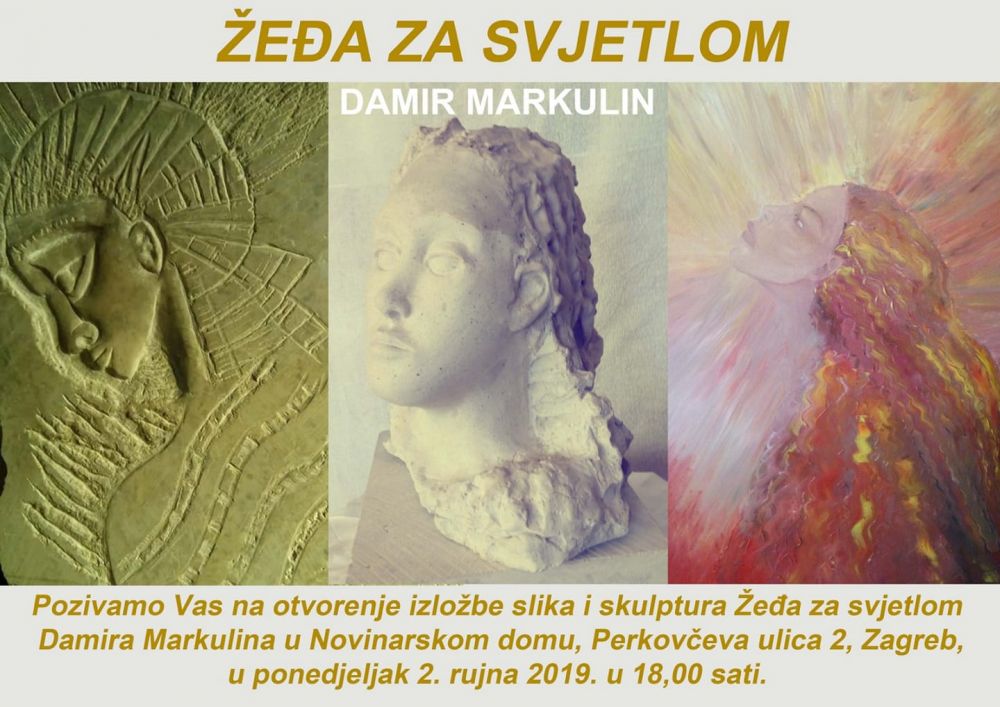 U ponedjeljak, 2. rujna u 18 sati u Novinarskom domu (Perkovčeva 2, Zagreb), otvara se izložba Damira Markulina, pod nazivom ”Žeđa za svjetlom”. Izložbu će otvoriti prof. dr. sc. Miljenko Buljac, a u dijelu programa predviđena je glazbena izvedba na violini.