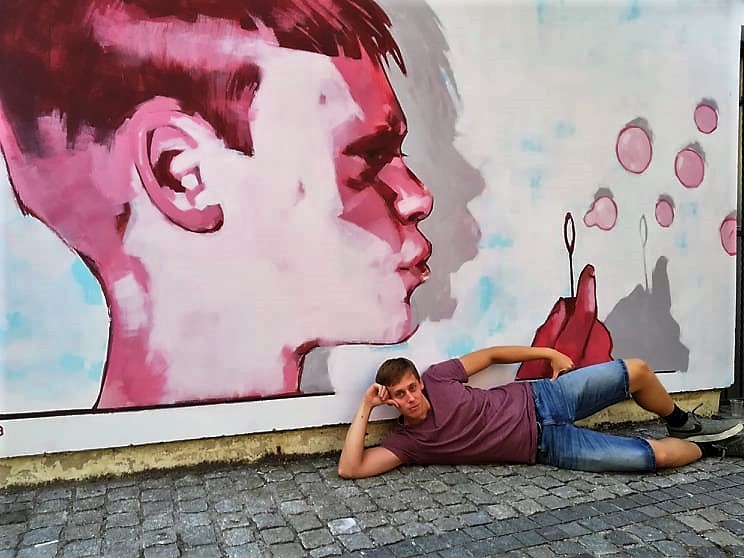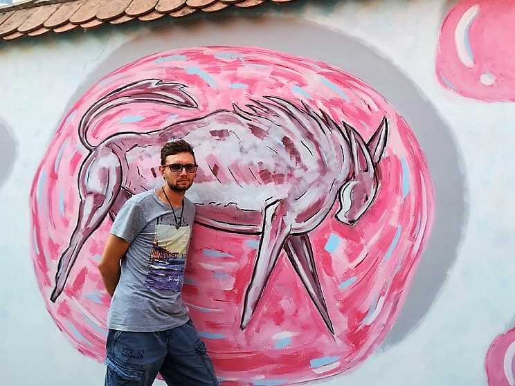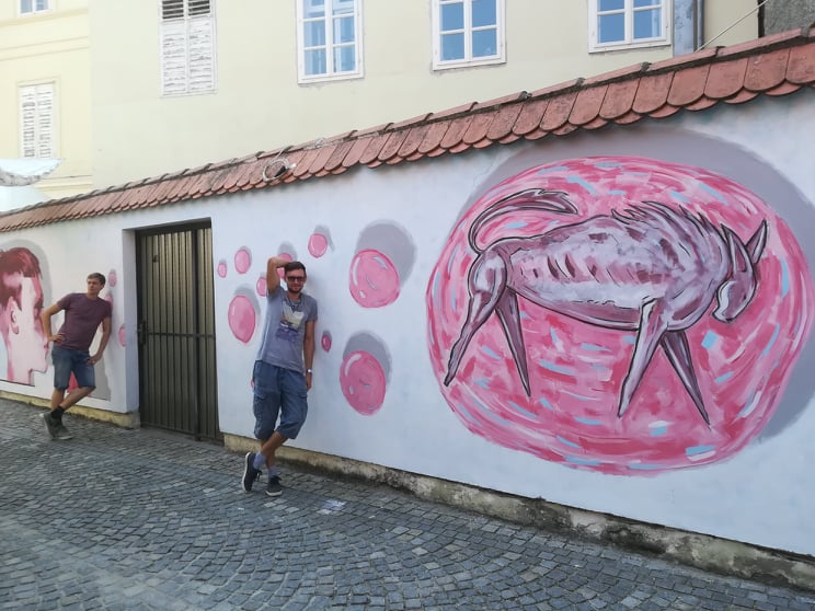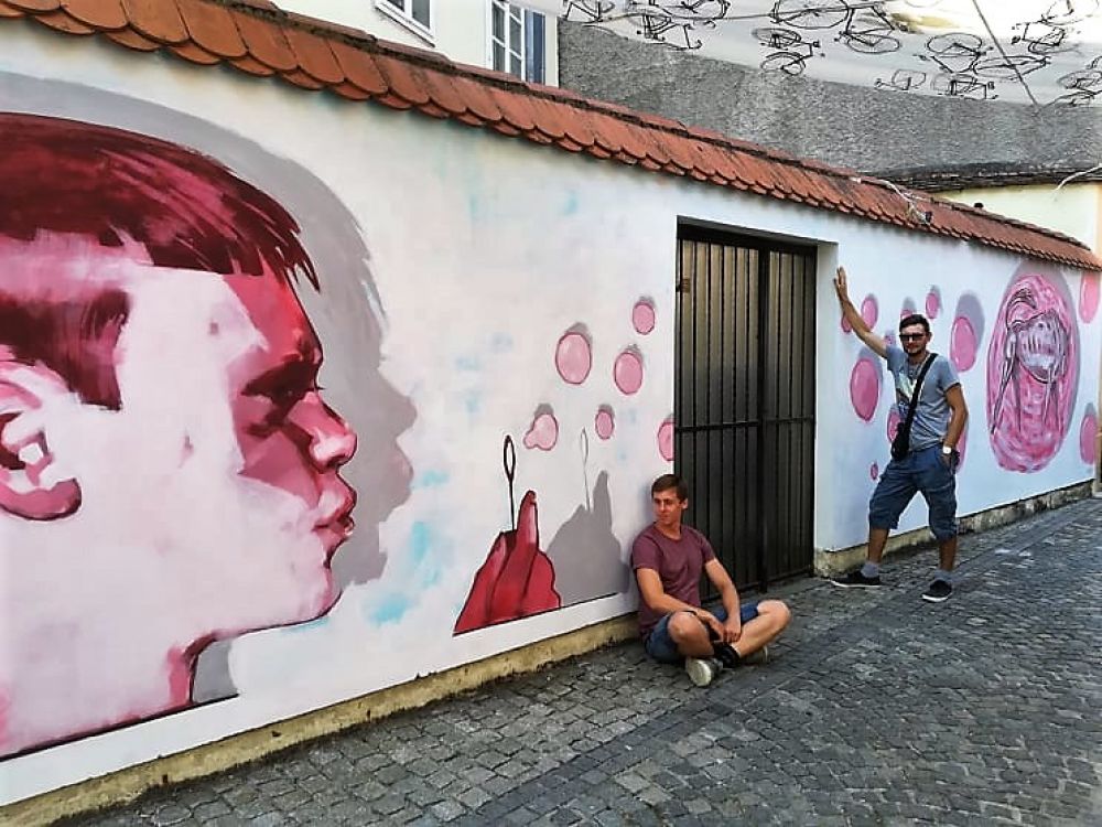 - Mihaelova je bila ideja o dječaku koji puše balončiće, kaže Ivan Mladenović, već poznati mladi varaždinski kipar, koji je na svom dijelu zida nadogradio Mihaelovu priču te u velikom mjehuriću koji se rastvara prije puknuća nacrtao psa.