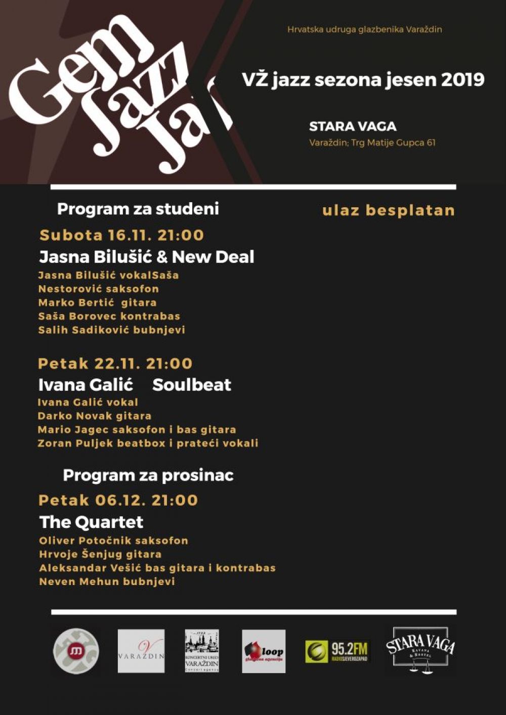 Varaždinka jazz jesen počinje uz Jasnu Bilušić i New Deal u subotu 16. studenoga u Staroj Vagi s početkom u 21 sat. Sljedeći koncerti su u petak 22. studenog kada nastupaju Ivana Galić i Soulbeat, te u petak, 6. prosinca, kada je na rasporedu koncert jazz sastava The Quartet.