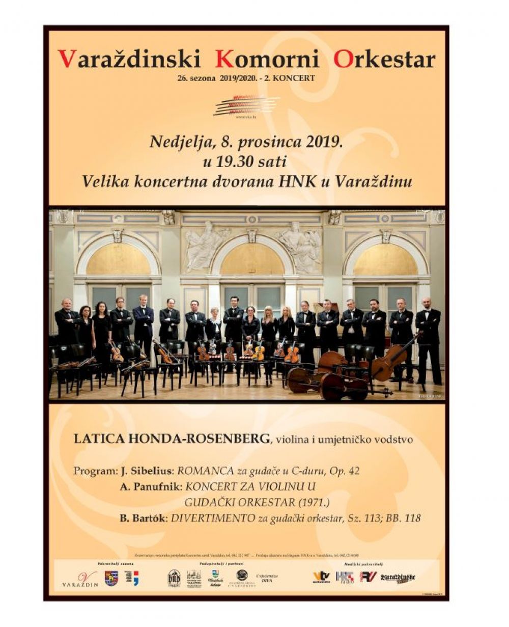 Kao svoj II. Pretplatnički koncert 26. sezone Varaždinski će komorni orkestar uz Dan Grada održati koncert pod umjetničkim vodstvom violinistice Latice Honda-Rosenberg. Na programu su djela J. Sibeliusa, A. Panufnika i B. Bartóka. Latica Honda-Rosenberg je kći hrvatske violončelistice i japanskog pjevača, odrasla u Njemačkoj i počela svirati violinu s četiri godine. Jedna je od najistaknutijih predstavnica mlade generacije violinista današnjice. Nakon što je osvojila srebrnu medalju na natjecanju Čajkovski u Moskvi 1998. godine, otpočela je međunarodnu karijeru. Osim koncertnih aktivnosti diljem svijeta, Latica Honda-Rosenberg Od 2003. godine predaje violinu. Prvo je bila profesorica na Musikhochschule u Freiburgu, a od travnja 2009. godine predaje na berlinskom sveučilištu (Berlin University of the Arts). Pretplatu vodi Koncertni ured Varaždin, a pojedinačne ulaznice rezervirava i prodaje blagajna HNK u Varaždinu. Učenici i studenti mogu i besplatno na galeriju.