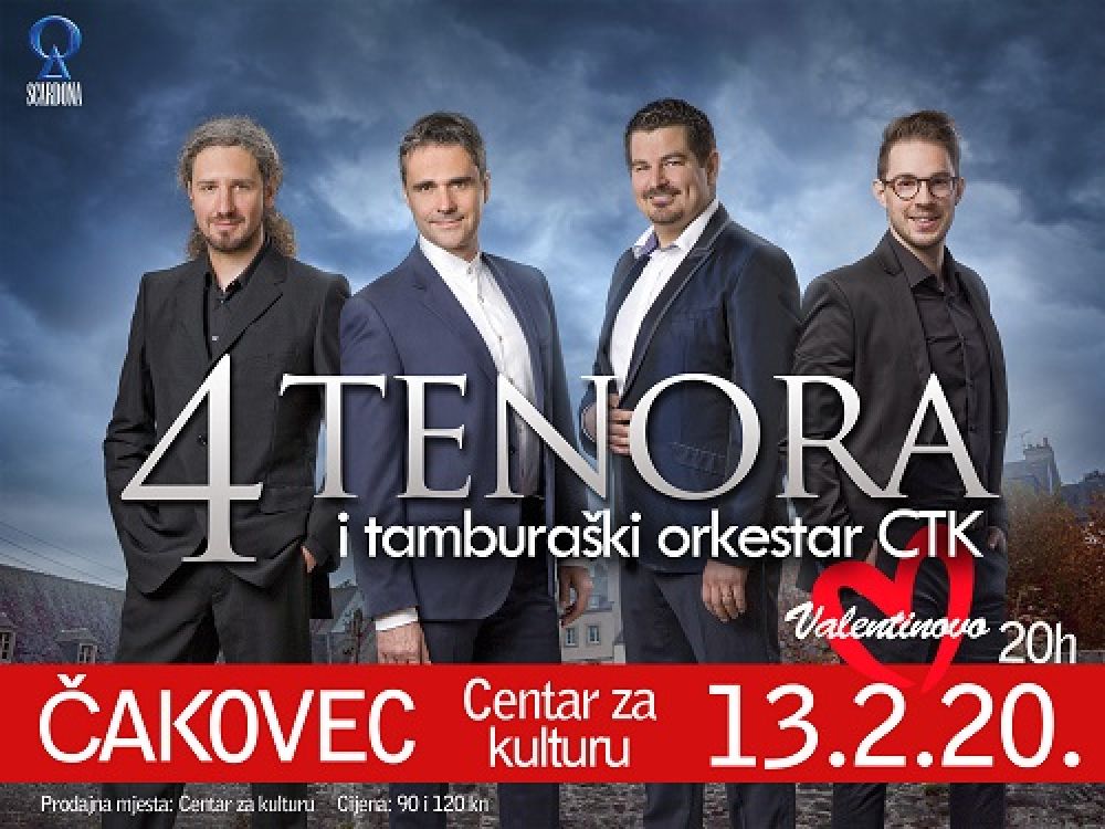 Veličanstvena četvorka stiže na sjever Hrvatske nakon što su u 2019. godini održali velik broj koncerata i pokazali da su izvrsna kombinacija za glazbeni užitak i opuštanje. Naime, za Valentinovo 4 Tenora, pobjednici Šibenske šansone 2019., stižu u Centar za kulturu grada Čakovca u 20 sati 13. veljače Marko Pecotić, Đani Stipaničev, Filip Hozjak i Vladimir Garić proteklu su godinu održali mnogo sjajnih koncerata, sudjelovali u humanitarnim akcijama, punili gledališta gdje god došli, bilo u Hrvatskoj, bilo u susjednim zemljama. Zato su 2020. odlučili započeti valentinovskim koncertom u Čakovcu na kojem nastupaju s Tamburaškim orkestrom TCK pod ravnanjem maestra Tibora Buna. Ova dobitna kombinacija oduševila je na rasprodanom koncertu na zatvaranju Špancirfesta u Varaždinu 2019. Ovo je sjajna prilika da svi koji nisu kupe ulaznice, dođu na koncert i osjete čaroliju 4 Tenora. Tenori su poznati po tome što vole publiku iznenaditi nekim novim pjesmama ili donijeti jedan potpuno novi zvuk s tamburaškim orkestrom. Čakovec i Tenori još pamte veličanstveni koncert na Porcijunkulovu 2018., kada su svojim sjajnim izvedbama i svojstvenim šarmom osvojili i raspjevali publiku koja ih nije puštala ni nakon nekoliko biseva. Tenori su bili oduševljeni kada su vidjeli koliko je tisuća ljudi došlo na koncert i to im je bila važna potvrda velike popularnosti koju su stekli u vrlo kratkom vremenu. Posjetitelji će tako u Čakovcu moći uživati u njihovoj interpretaciji poznatih arija, šansona i evergreena, kao i u novim glazbenim iznenađenjima koje pripremaju baš za ovo druženje. Brod bez imena, Sve je tvoje, O sole mio, Golubovi, samo su neke od uspješnica koje očekuju publiku. Uvijek nasmijani Vlado, Filip, Đani i Marko publiku redovito dižu na noge i ostavljaju bez daha svojim vrhunskim glasovima. Ali i izgledom i pošalicama koje uvijek doprinesu opuštenoj koncertnoj atmosferi, koja daje poseban štih njihovom zanimljivom i nimalo lakom repertoaru. Svoju su dosadašnju karijeru obilježili fenomenalnim koncertom 14. rujna 2019. na zagrebačkoj Šalati s Revijskim orkestrom Zagrebačke filharmonije i gostima Radojkom Šverko i Goranom Karanom. Prepuna Šalata, zvijezde, mjesečina - ugođaj je bio neprocjenjiv! Uslijedili su koncerti po kontinentalnom dijelu Hrvatske i susjedstva. Po prvi put su nastupili u Osijeku, i to u okviru hvalevrijedne humanitarne akcije, a publika ih je počastila pozitivnim komentarima na društvenim mrežama. Krajem godine nastupili su i na Božićnom gala koncertu u Bjelovaru, u prepunoj Dvorani europskih prvaka. Dok čekate nastup u Čakovcu, pogledate kakva je atmosfera vladala na koncertu 4 Tenora u Ciboni 2018.! I zato nemojte propustiti ovaj izvrsni koncert prožet ljubavnim stihovima, u prigodno ljubavno vrijeme. Ulaznice po cijeni od 90 i 120 kuna možete kupiti od 13. siječnja na blagajni Centra za kulturu Čakovec. |