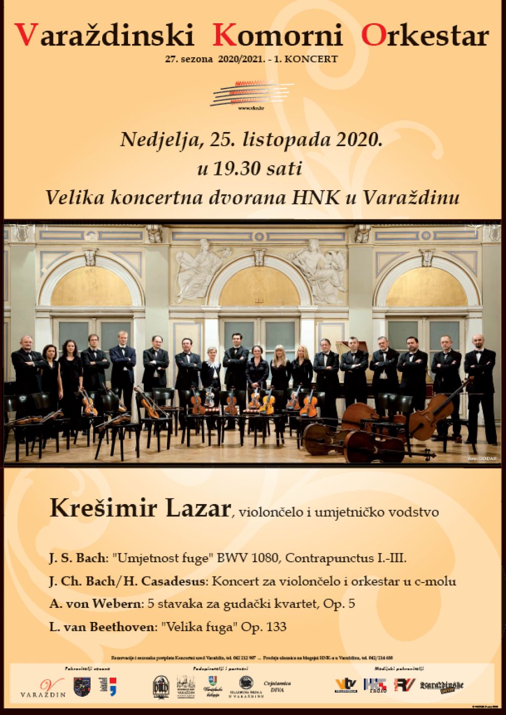 U nedjelju 25. listopada u 19,30 sati Varaždinski komorni orkestar počinje s pretplatničkim koncertima 27. sezone u Velikoj koncertnoj dvorani HNK u Varaždinu. Prvi je koncert sa solistom na violončelu i umjetničkim vodstvom Krešimira Lazara šefa orkestra. Lazar se do sada istaknuo i kao nagrađivani komorni glazbenik sa Cameratom Garestin i Amadeus triom, ali i sa mnogim velikim orkestrima u zemlji i inzemstvu. Na prvom koncertu sezone solist je u djelima za violončelo J. S. Bacha, J. Ch. Bacha, A.von Weberna i L.van Beethovena. Uz epidemiološke mjere pretplatničke kartice za cijelu sezonu možete uz telefonsku najavu podići u Koncertnom uredu, a pojedinačne ulaznice na blagajni HNK u Varaždinu.
