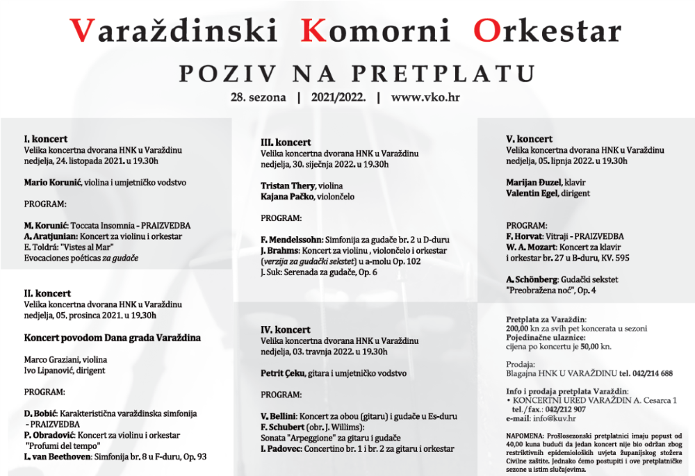 Koncert će započeti u 19:30 sati u Velikoj koncertnoj dvorani HNK u Varaždinu, a za koncert nisu potrebne Covid potvrde budući da će se poštivati važeće epidemiološke mjere uz nošenje zaštitnih maski i održavanje nužnog razmaka.