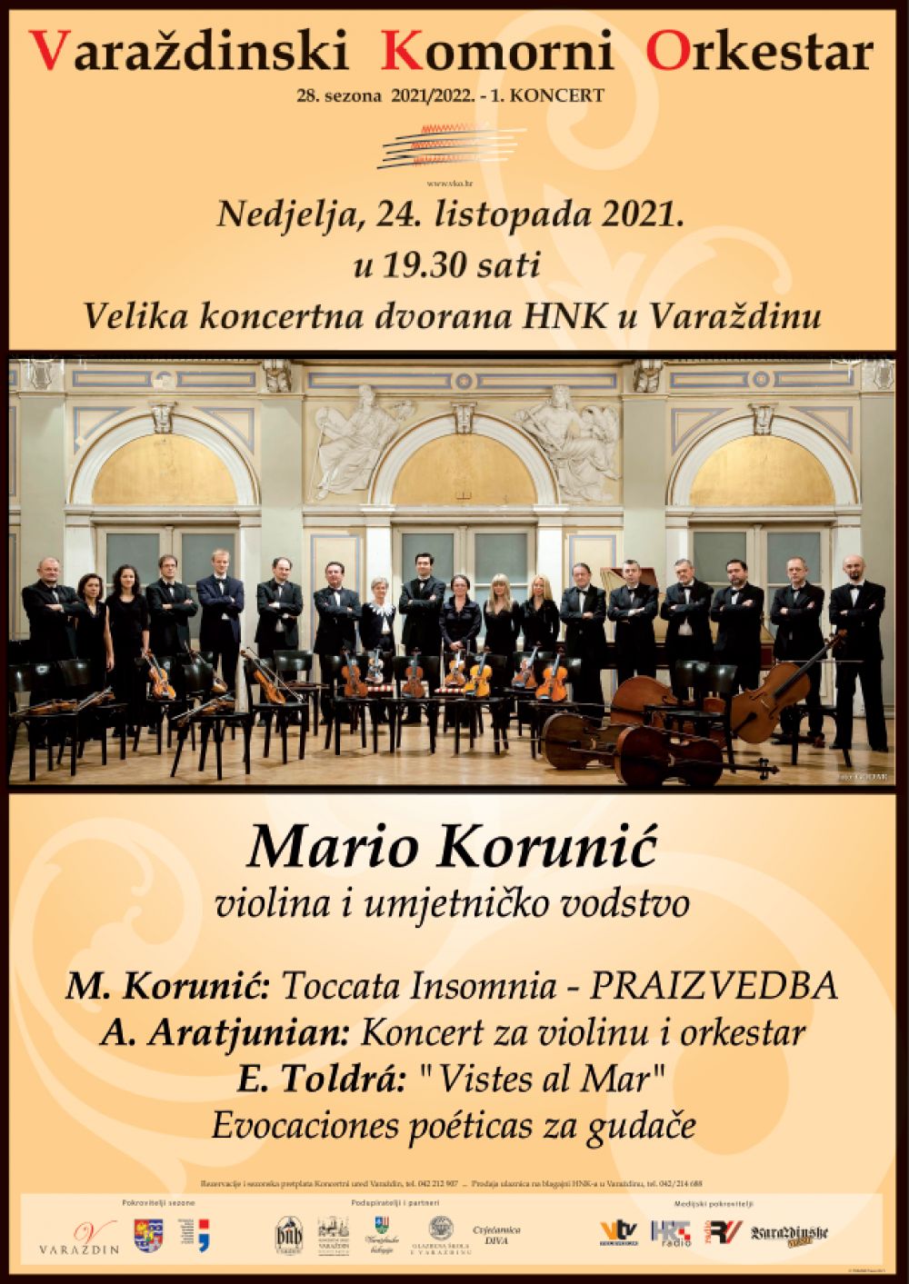 Za početak nove sezone, u nedjelju 24. listopada očekuje nas koncert Varaždinskog komornog orkestra uz gosta Maria Korunića na violini i kao umjetničko vodstvo.