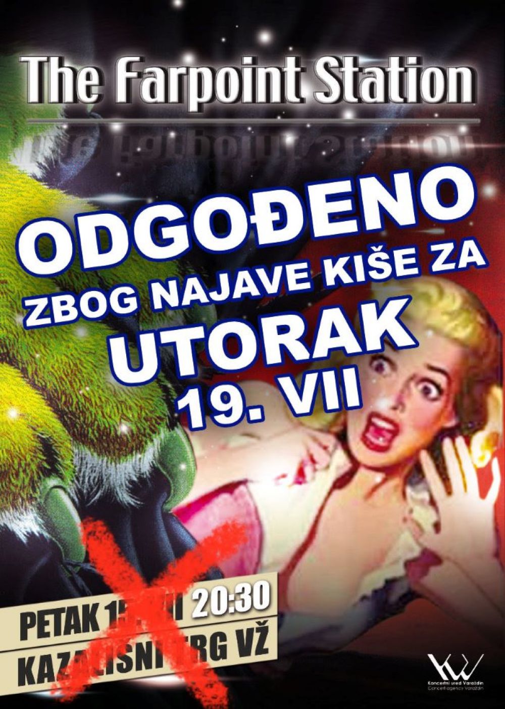 Zbog najavljenih nepovoljnih vremenskih uvjeta, koncert varaždinske grupe The Farpoint Station koji se trebao održati danas na Kazališnom trgu u Varaždinu, održat će se u utorak, 19. srpnja s počekom u 20:30 sati.