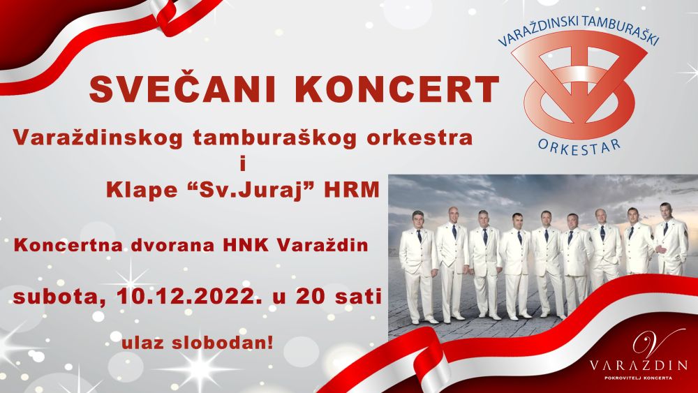 U subotu 10.prosinca od 20 sati u koncertnoj dvorani HNK Varaždin održat će se svečani koncert Varaždinskog tamburaškog orkestra i klape „Sv. Juraj“ HRM. Koncert se održava pod pokroviteljstvom Grada Varaždina u sklopu obilježavanja Dana Grada Varaždina. VTO i klapa „Sv. Juraj“ HRM uspješno surađuju već godinama, zajednički nastupajući na „Špancirfestu“, Danu Grada Splita te na raznim koncertima u organizaciji VTO-a i Klape.