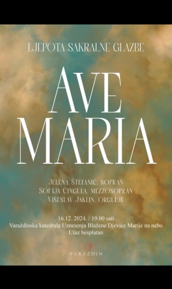 Sopranistica Jelena Štefanić, mezzosopranistica Sofija Cingula i orguljaš Višeslav Jaklin na koncertu 16. prosinca u varaždinskoj katedrali Uznesenja Blažene Djevice na nebo izvode „Ave Mariu”. Koncert „Ave Maria” u izvedbi ovog vrsnog glazbenog trija počinje u 19 sati, a ulaz je zahvaljujući pokroviteljstvu Grada Varaždina – besplatan. Koncert je osmislila Jelena Štefanić u okviru projekta Ljepota sakralne glazbe.