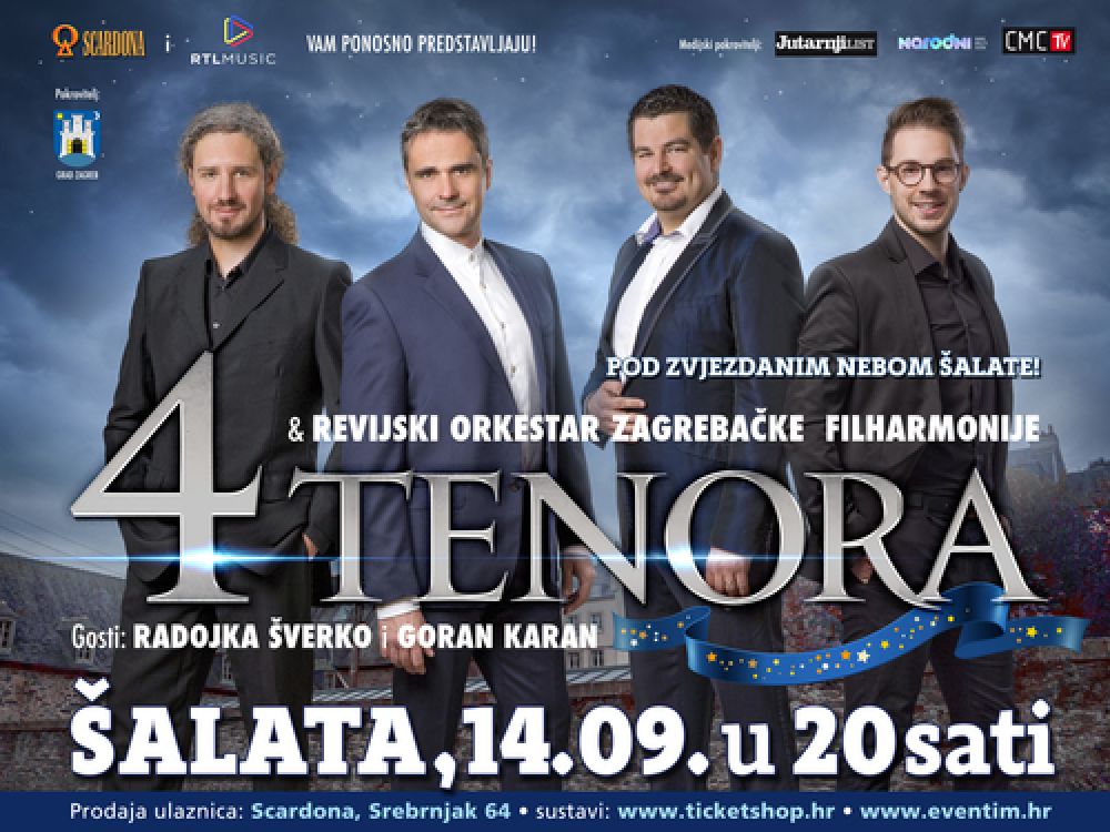 4 Tenora nam donose pravu glazbenu poslasticu na spektaklu pod zvjezdanim nebom na zagrebačkoj Šalati 14.09.2019. Nakon niza rasprodanih koncerata u prestižnim koncertnim dvoranama širom Hrvatske i ljetne turneje koja je u tijeku, 4 Tenora pripremaju nam još jedan veliki glazbeni spektakl u Zagrebu, ovog puta na Šalati. Svaki njihov novi koncert u Zagrebu željno se isčekuje jer su svojom kvalitetom, odličnim nastupom i pozitivnom energijom brzo osvojili publiku. Tenori su u nepune tri godine od prvog nastupa u Lisinskom samo uz klavir do koncerta u KD Dražen Petrović uz Revijski orkestar Zagrebačke filharmonije pod ravnanjem maestra Krešimira Batinićapostali miljenici publike i svaki put publici pružali drugačiji glazbeni doživljaj. 4 Tenora nastupiti će na Šalati uz Revijski orkestar Zagrebačke filharmonije pod ravnanjem maestra Dinka Appelta za veličanstveni doživljaj pod zvjezdanim nebom Šalate, orkestar će popuniti zvuk i pridonjeti orkestralnom doživljaju glazbe. Pripremljeno je uz standarni repertoar Tenora nekoliko novih glazbenih iznenađenja koji će uz orkestar biti pravi užitak. Gosti će dati još jednu novu dimenziju koncertu, a to su fenomenalni Goran Karan i jedinstvena Radojka Šverko koja je pjevala "Con Te Partiro" s Tenorima s kojom su oduševili Lisinski. Vjerujemo kako će ljetna večer uz njihove glasove izgledatisenzacionalno kada se na jednom koncertu okupi glazbena vokalna elita. Šalata je izabarana jer je jedinstveni koncertni prostor u centru gradakoji publika voli i idealan je za koncertne spektakle, a ima i sjajnu glazbenu prošlost mjesta na kojem su se odvijali veliki koncerti koji su postali dio glazbene prošlosti Zagreba. Koncerti "Opera pod zvjezdama" na Šalati bili su odlično prihvaćeni, a sigurni smo da će "4 Tenora i revijski orkestar Zagrebačke filharmonije pod zvjezdanim nebom Šalate" biti koncert koji će se dugo pamtiti! Dobra referenca na koncerte u Šalati je uspješan koncert koji su nedavno održale dalmatinske klape pod organizacijom Scardone i RTL Musica. 5.000 ljudi je pjevalo u glas sve najpoznatije hitove Tomislava Bralića i klape Intrade, klape Šufit, Cambi i klape Maslina. Produkciju koncerta radi stalni tim Scardone i Digiloga koji su se specijalizirali za produkciju zahtjevnijih koncerata tako da se publici omogući potpuno uživanje u koncertu. Na Šalati će biti postavljena velika krovna konstrukcija, scenografija, a pozornica će bit u tri nivoa za revijski orkestar. |