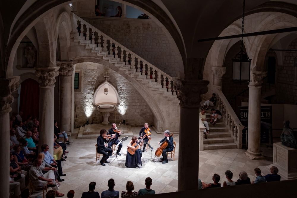 Sinoćnji zajednički nastup najstarijeg hrvatskog komornog ansambla Zagrebačkog kvarteta, koji je u travnju ove godine proslavio 100. obljetnicu osnutka, i virtuozne gitarističke umjetnice Ane Vidović donio je izvedbu dva Vivaldijeva koncerta za lutnju i mandolinu u obradi za gitaru i gudače koju potpisuje gitarski virtuoz i pedagog Karl Scheit, poznat i kao „austrijski Segovia“. Ana Vidović prvi je put na Dubrovačkim ljetnim igrama nastupila 1997. i za taj nastup osvojila nagradu Orlando te time postala najmlađa laureatkinja s nepunih 17 godina, a njen drugi nastup bio je upriličen prije točno 20 godina. „Knežev dvor je prekrasan prostor, pogotovo za klasičnu gitaru. Idealno akustičan i zapravo je rijetko pronaći takav savršen prostor ujedno prelijep koji glazbeniku daje posebno nadahnuće“, kazala je Ana Vidović povodom ovog dugo iščekivanog nastupa. Ana Vidović je od svojeg prvog koncerta koji je održala u osmoj godini obišla svijet oduševljavajući publiku na više od tisuću koncerata u prestižnim dvoranama i prostorima na svim kontinentima, a već više od 15 godina živi i radi u SAD-u te su, nažalost, njena pojavljivanja na hrvatskim glazbenim pozornicama rijetka. Sinoćnji festivalski nastup bio je ujedno i prvi umjetnički susret Ane Vidović i Zagrebačkog kvarteta koji je, u svojih 100 godina postojanja, često nastupao na Dubrovačkim ljetnim igrama. Od prvog nastupa 1958. brojimo ih tridesetak, a posljednji je njihov samostalni koncert na Igrama održan prije 10 godina, uz njihovu 90. obljetnicu, kada im se priključio i pjevač Krešimir Špicer. Stoga ne čudi zainteresiranost publike za koncert ove gitarističke velemajstorice i Zagrebačkog kvarteta koji su svojom vrhunskom interpretacijom pomno osmišljenog programa zadivili ljubitelje glazbe u Dvoru. Osim Vivaldijevih koncerata u obradi Karla Scheita, nakon čega je Ana Vidović publiku počastila virtuoznom solo izvedbom Tárreginog Sjećanja na Alhambru, Kvartet je izveo i Beethovenov treći gudački kvartet u D duru, najliričniji i najsuptililniji iz opusa 18, zatim rano djelo Marka Ruždjaka Klasični vrt, koji je Kvartet praizveo 1978. upravo u Kneževu dvoru, te prvi i jedini Ravelov gudački kvartet, nastao u studentskim danima ovog skladatelja.