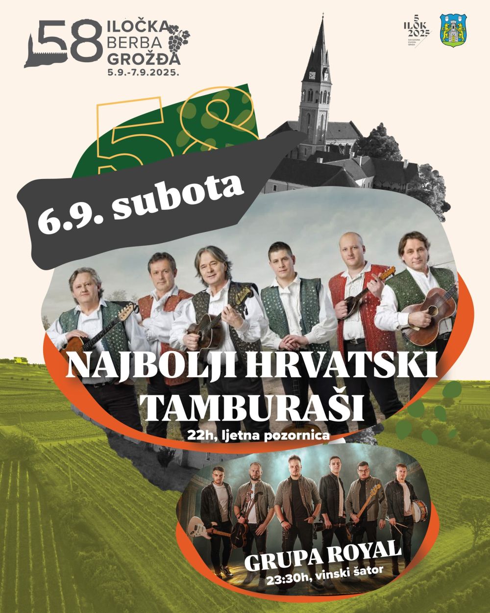 U subotu, 6. rujna od 20:30 sati, započinje svečano otvorenje 58. Iločke berbe grožđa – manifestacije koja već desetljećima slavi bogatstvo vinograda, kulturnu baštinu i zajedništvo. Uz svečane govore i nastupe kulturno-umjetničkih društava, publika će moći doživjeti i poseban trenutak – berbu prvog grozda uz prikaz pudarine, starog običaja čuvanja vinograda. Večer će završiti u veselom ritmu i koncertom Najboljih hrvatskih tamburaša i uz sjajni vatromet nad Ilokom.