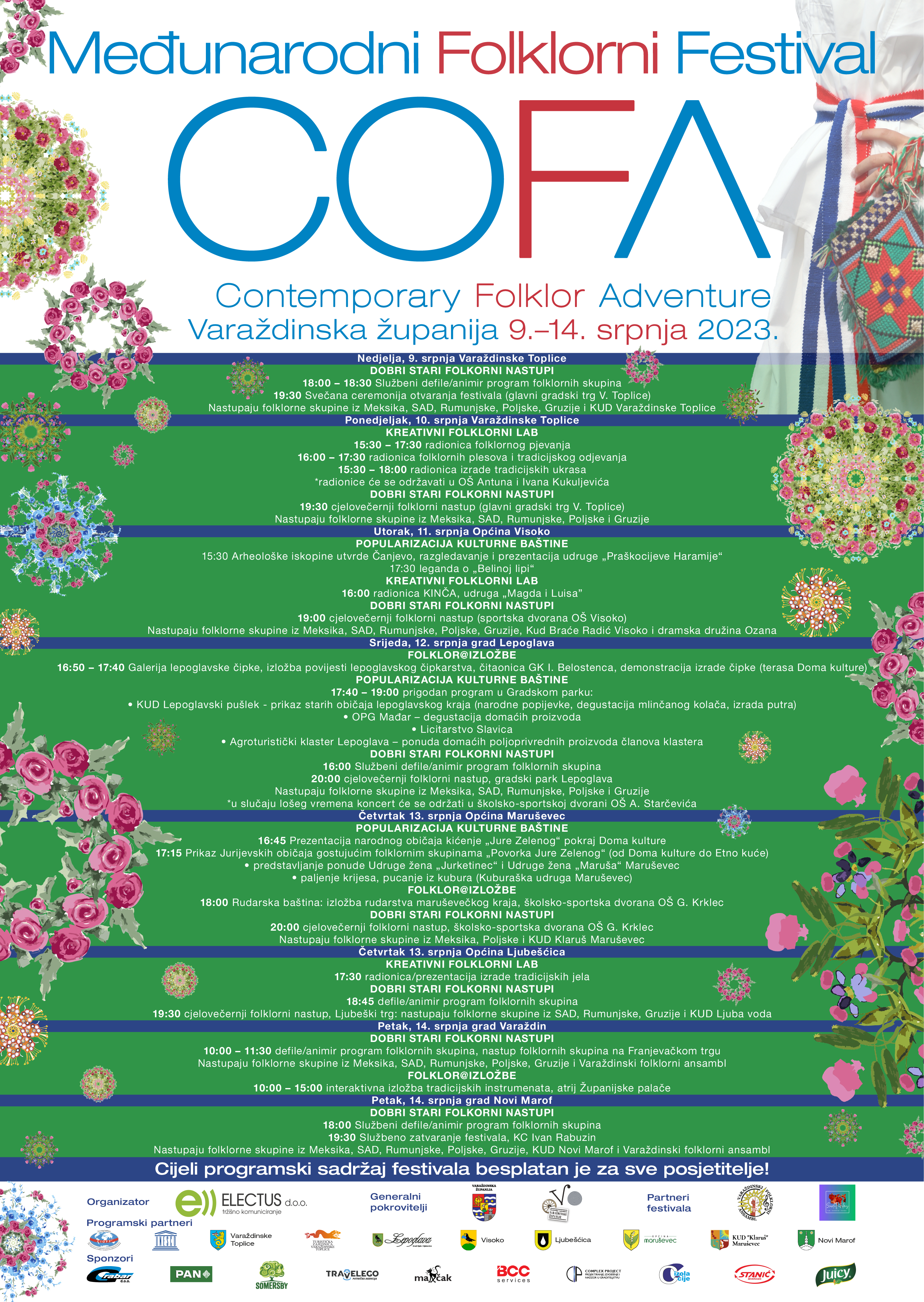 I ove godine nam u goste dolaze atraktivne folklorne skupine iz cijelog svijeta, a posebno bih izdvojila dvije skupine koje prvi puta dolaze u Hrvatsku na COFA festival. Riječ je o folklornoj skupini iz Meksika i Sjedinjenih Američkih Država, a dolaze nam i grupe iz Rumunjske, Poljske i Gruzije. Od domaćih folklornih grupa predstavit će se Varaždinski folklorni ansambl, KUD „Toplice“ iz Varaždinskih Toplica, KUD „Braća Radić“ iz Općine Visoko, dramska družina Ozana, KUD „Klaruš“ iz Maruševca, KUD “Ljuba voda“ iz Ljubešćice te KUD „Marof“ iz Novog Marofa – najavila je Petra Golubar.
