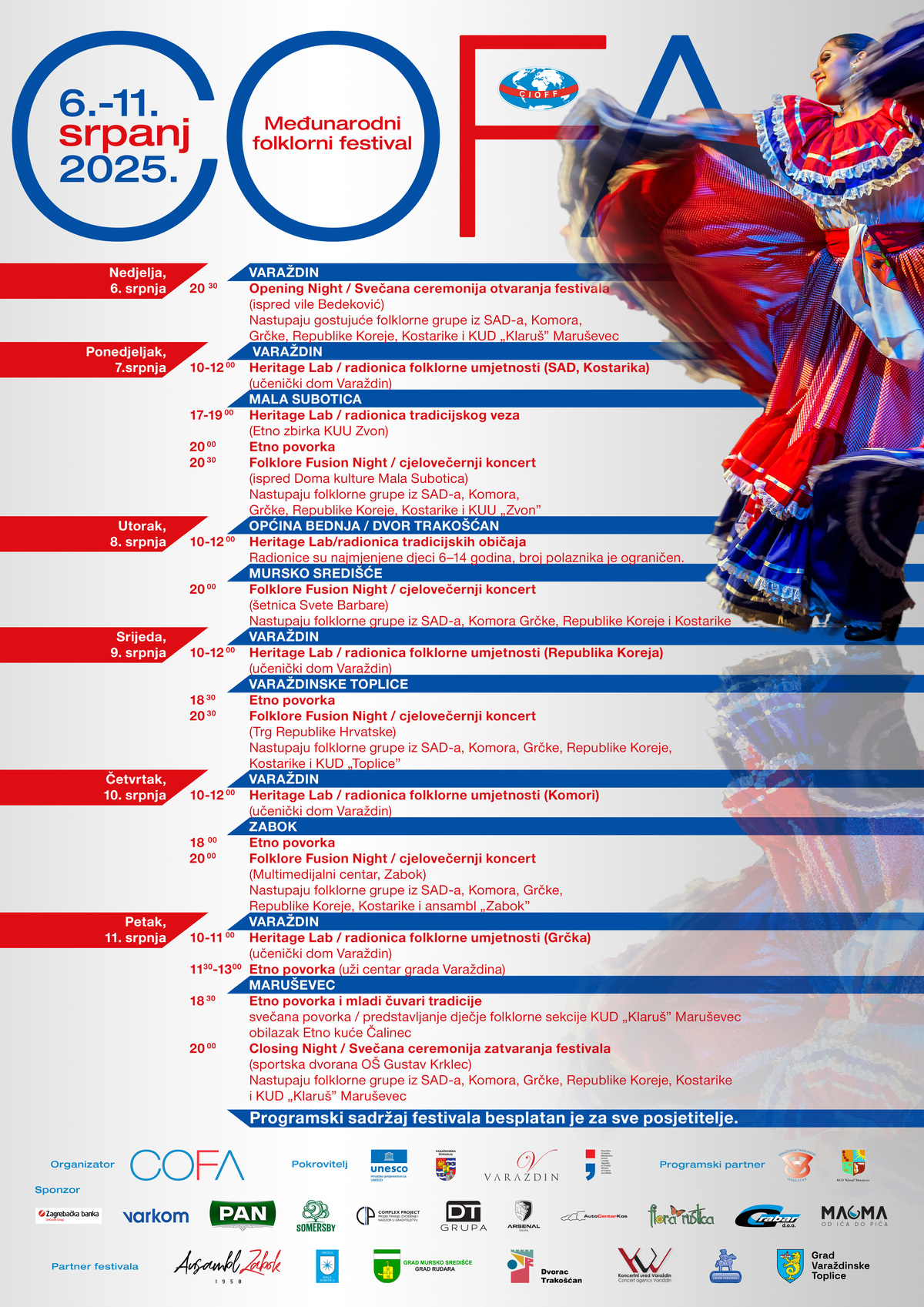 Okupljenima se obratio i gradonačelnik Grada Varaždina dr. sc. Neven Bosilj.-Varaždin s ponosom nosi titulu grada folklora. Ovdje folklor nije samo ples – on je glazba, ples i pjesma, ali i ono najvažnije – zajedništvo koje povezuje ljude, generacije i kulture. Ove godine, na festivalu COFA, ugostit ćemo folklorne skupine iz Kostarike, Južne Koreje, Sjedinjenih Američkih Država i Grčke, a našu hrvatsku tradiciju s ponosom predstavlja domaći KUD Klaruš iz Maruševca. Festival je lijepa priča koja povezuje tri kontinenta, pet država i tri hrvatske županije. Iako je središte događanja u Varaždinu, program se širi i na Međimursku i Krapinsko-zagorsku županiju. Vjerujem da će svi posjetitelji uživati u raznolikosti plesova, glazbe i nošnji, i da će ponijeti nezaboravne uspomene. Nadam se da će nas, uz bogat program, pratiti i lijepo vrijeme – jer sve drugo već imamo: glazbu, ples, osmijehe i dobru volju – rekao je Bosilj poželjevši goste dobrodošlicu u Varaždin – grad kulture.