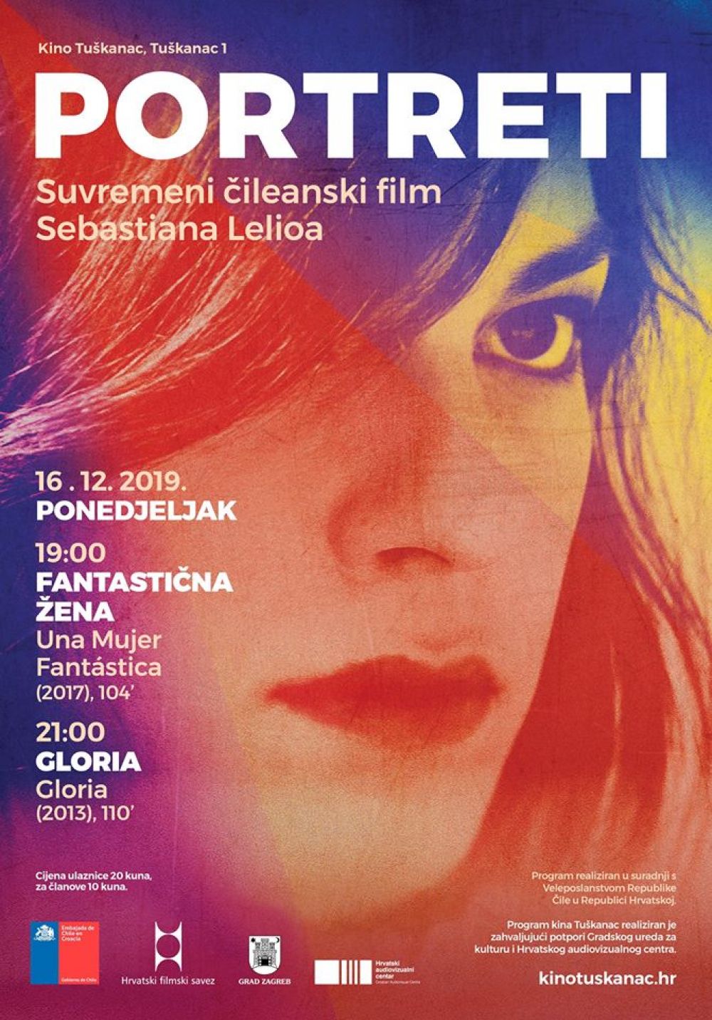 U okviru večeri suvremenog Čileanski filma -idućeg ponedjeljka, 16 prosinca u kinu "Tuškanac", Ulica 1, Zagreb bit će predstavljena dva filma nacionalnog direktora Sebastiana Leilo. Prva projekcija je u 19 sati, a prikazat će se film "Fantastična žena" (2017), dobitnik nagrade Oscar kao najbolji film na stranim jezicima 2018. godine. Sljedeći film na rasporedu je u 21, a bit će to film "Gloria" (2013), koji je nominiran za nagradu Oscara. Cijena ulaznice je 20 kuna.