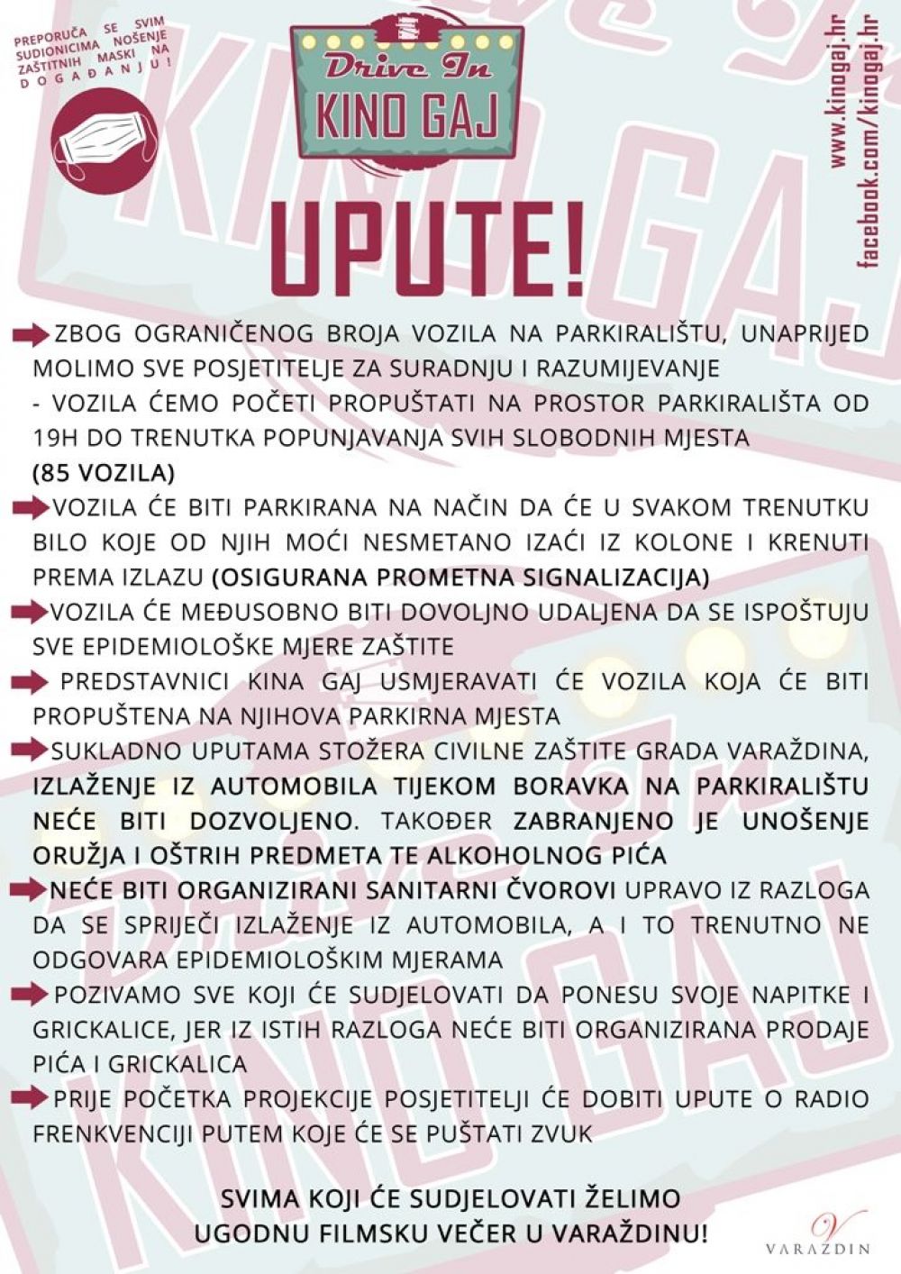 Najvažnije upute odnose se na obavezu zadržavanja svih posjetitelja u automobilima zbog pridržavanja epidemioloških mjera te stoga nije organizirana prodaja pića i grickalica, već će ih posjetitelji moći ponijeti sa sobom. Cijelo događanje organizirano je na način da se građanima omogući sudjelovanje uz pridržavanje mjera socijalne distance i svih ostalih epidemioloških smjernica. Kino GAJ će nastaviti kreativno promišljati načine približavanja filmskog sadržaja svojoj publici. Vjerujemo da će posjetitelji doživjeti film iz svojih automobila na jedinstven način. Želimo svima koji će sudjelovati ugodnu filmsku večer uz Kino GAJ.