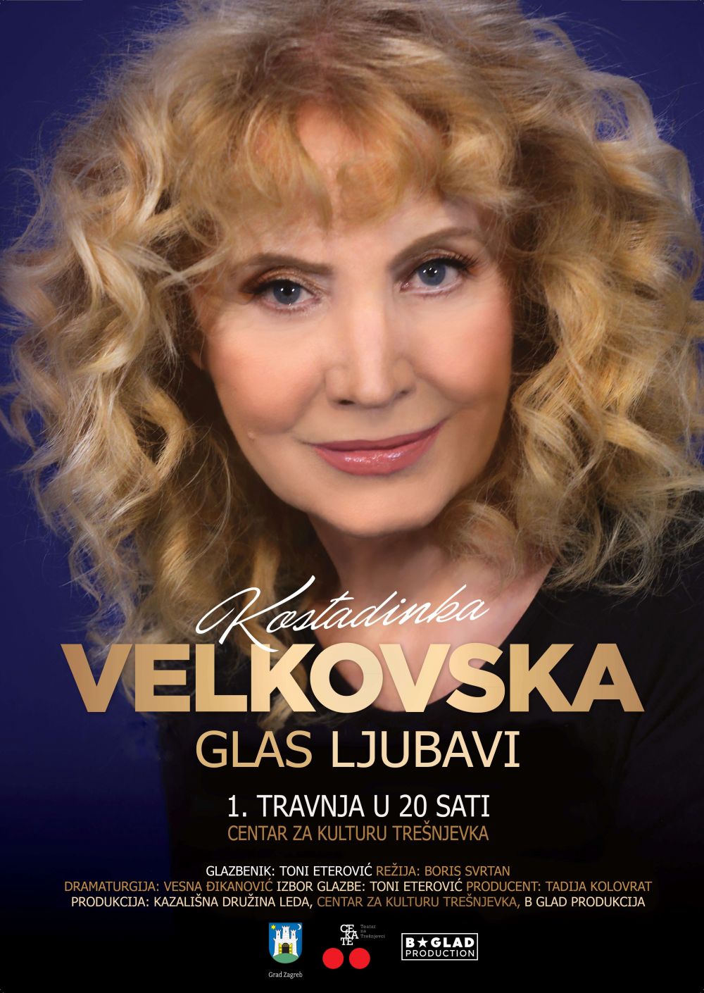 Praizvedba predstave "Glas ljubavi" bit će u četvrtak, 1. travnja 2021. s početkom u 20 sati u Centru za kulturu Trešnjevka u Zagrebu. Režiju potpisuje Boris Svrtan, dramaturgiju Vesna Đikanović, a produkciju Tadija Kolovrat. Glumačku izvedbu Kostadinke Velkovske prati glazbenik Toni Eterović koji je i odgovoran za izbor glazbe. Predstava je koprodukcija Kazališne družine "Leda", B GLAD produkcije i Centra za kulturu Trešnjevka.