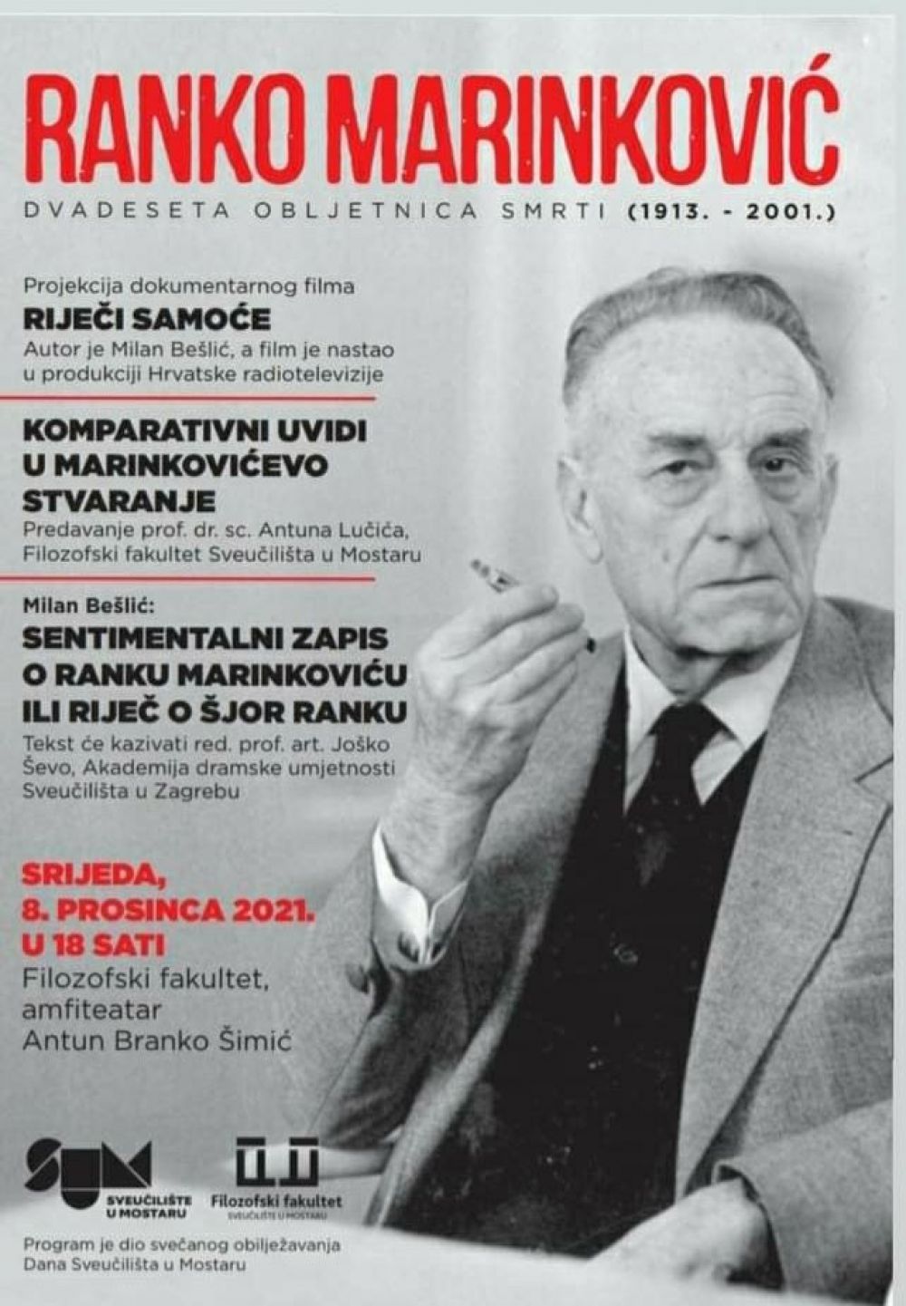 Svečani program posvećen Ranku Marinkoviću, održan je u povodu 20 godina od smrti velikog hrvatskog književnika i akademika, na pozornici Akademije dramske umjetnosti (ADU) u Zagrebu 1. prosinca. Program se sastojao od projekcije dokumentarnog filma „Riječi samoće“, snimljenog 1999. godine, autora Milana Bešlića. Nakon pozdravne riječi izv. prof. art. Davora Švaića, dekana Akademije dramske umjetnosti u Zagrebu o filmu su govorili doc. dr. Bruno Kragić i dr. sc. Tomislav Brlek, izv. prof. Filozofskoga fakulteta u Zagrebu.