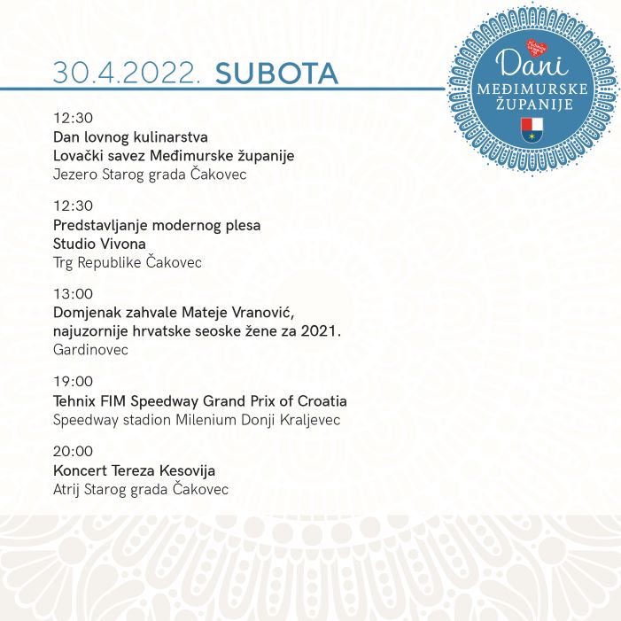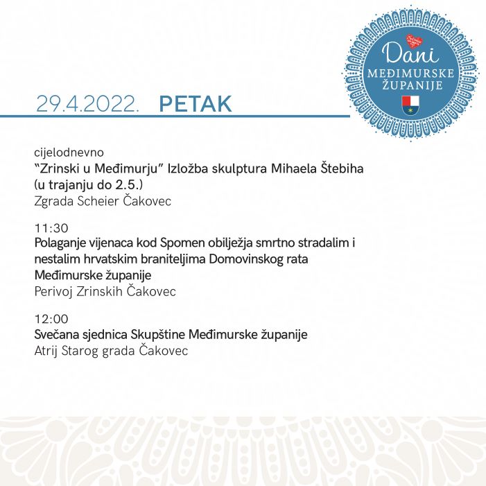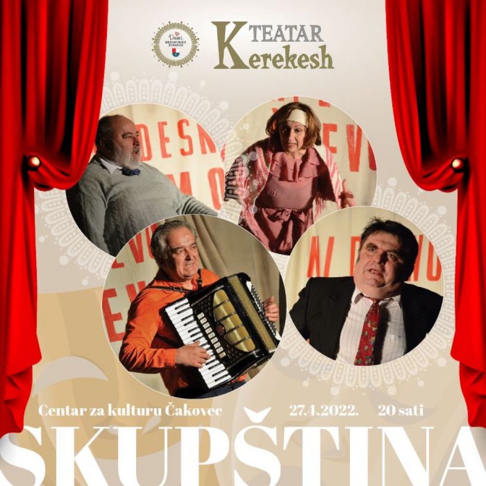 Iako je bilo najavljeno da će se predstava održati u ambijentu atrija Starog grada Zrinskih, zbog loših vremenskih uvjeta, višestruko nagrađivana predstava „Skupština“ odigrat će se u Centru za kulturu Čakovec. U predstavi igraju Ljubomir Kerekeš, Draško Zidar, Mijo Pavelko i Marija Krpan. Početak je u 20 sati, a ulaz je besplatan, kao i na sva događanja koja se odvijaju u okviru Dana Međimurske županije.