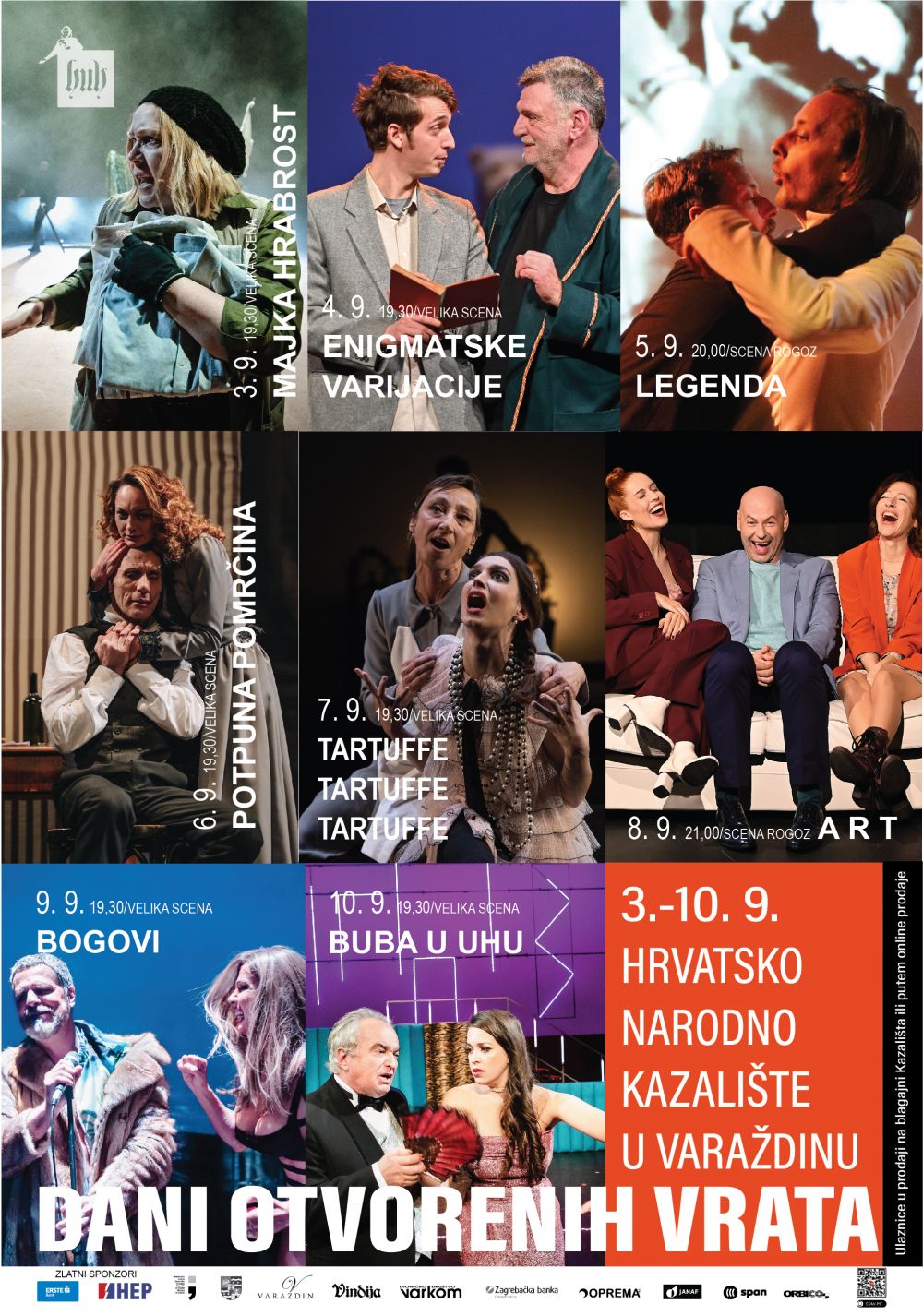 Od 03. do 10.09. na rasporedu su Dani otvorenih vrata. U tom tjednu igrat ćemo osam naših naslova, svaki dan po jedan i to po popularnoj cijeni od 4 eura za tu prigodu. Na rasporedu su Majka hrabrost i njezina djeca, Enigmatske varijacije, Legenda, Potpuna pomrčina, Tartuffe Tartuffe Tartuffe, Art, Bogovi i Buba u uhu. Publika će imati priliku glasati za najbolja glumačka ostvarenja. Dodjela nagrade koja nosi ime po legendarnom varaždinskom glumcu Tomislavu Lipljinu bit će 24.9. na dan kad je prije 150 godina otvorena zgrada.
