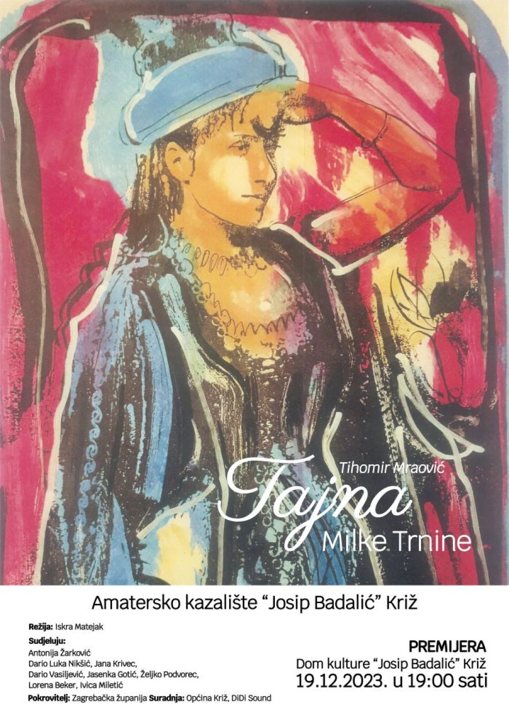 Premijera kazališne predstavu „Tajna Milke Trnine“, autora Tihomira Mraovića, u izvedbi Amaterskog kazališta „Josip Badalić“ Križ održat će se u utorak, 19. prosinca s početkom u 19 sati u Domu kulture „Josip Badalić“ (Zagrebačka 2, Križ).