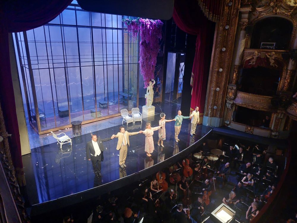 Nitko nije sporedan lik, Grof Rambaldo u uvjerljivoj izvedbi Siniše Hapača vođen je poput ruskog basa iz Evgenija Onjegina koji duboko voli svoju damu. Lepršavi Prunier (Martin Sušnik) i njegova draga Lisette (Marija Kuhar Šoša) razgovijetno, bestežinski uživaju u koloraturama. Hugo de Ana režiser, kostimograf, scenograf, raspojasano se u stilu fin de siecla i propasti stare Europe koja nikako ne može rasplesti čvor raznih “izama” pletiva prepuštajući se dekadentnosti, obilju skupih i finih materijala, boja koje su sigurno vladale i Titanicom.