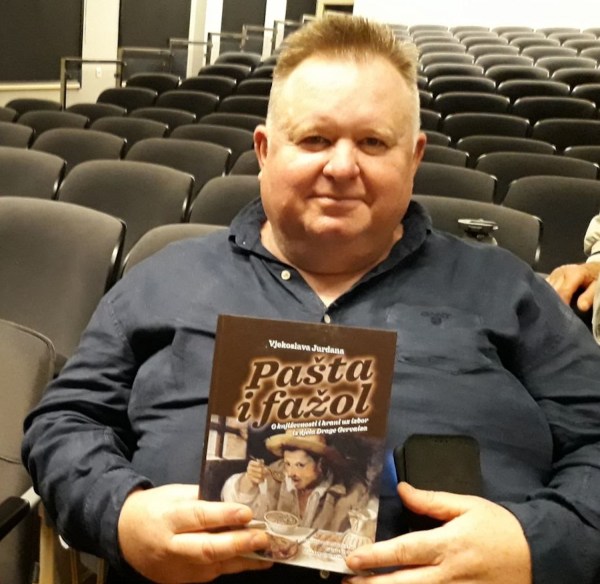 Vjekoslava Jurdana sa svojom knjigom Pašra Fažol / O književnosti i hrani uz izbor iz djela Drage Gervaisa (Fotografija Miljenko Brezak / Oblizeki)