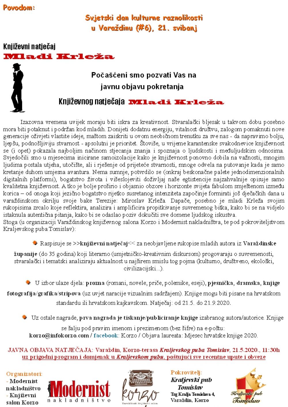 Književni natječaj za rukopise mladih autora iz Varaždinske županije otvoren je do 21. rujna. Idejni začetnik je Robertino Bartolec, vjerojatno najagilniji varaždinski promotor književnosti i pisane riječi. Forme su po izboru. Više o natječaju možete saznati na stranici www.modernist.hr