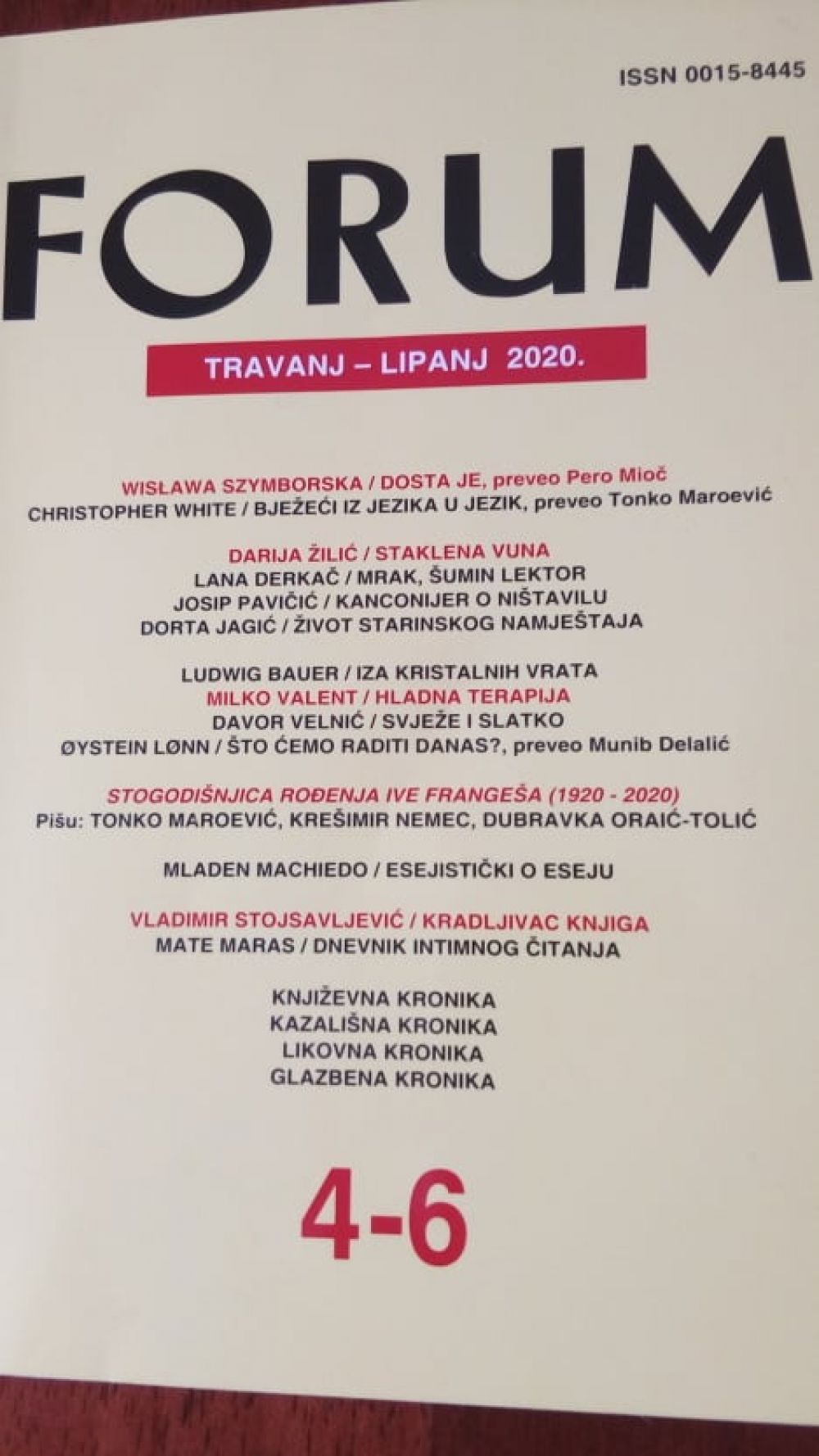 U novom broju časopisa Forum broj 4-6. travanj-lipanj 2020., mjesečnika razreda za književnost Hrvatske akademije znanosti i umjetnosti, objavljene su pjesme nobelovke Wislawe Szymborske u prijevodu Pere Mioča, Christophera White-a u prijevodu Tonka Maroevića . Objavljene su i pjesme suvremenih hrvatskih pjesnika Josipa Pavičića, Lane Derkač , Darije Žilić i Dorte Jagić, proza Ludwiga Bauera, Milka Valenta ,Davora Velinčića.