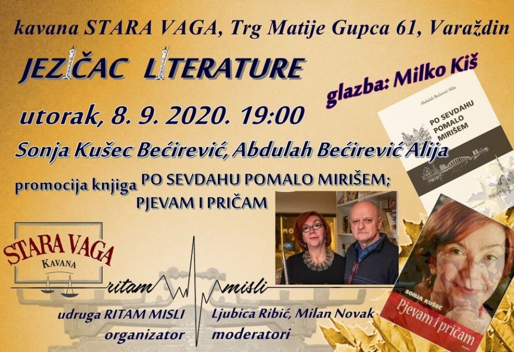 Udruga za promociju književnosti Ritam misli u utorak 08.rujna u 19 sati organizira književnu večer u sklopu programa Jezičac literature u kavani Stara vaga, Trg Matije Gupca 61 promociju dviju knjiga. Predstavit će se autori Abdulah Bećirević Alija s knjigom Po sevdahu pomalo mirišem i Sonja Kušec Bećirević s knjigom Pjevam i pričam. U glazbenom programu sudjeluje zagrebački kantautor Milko Kiš.