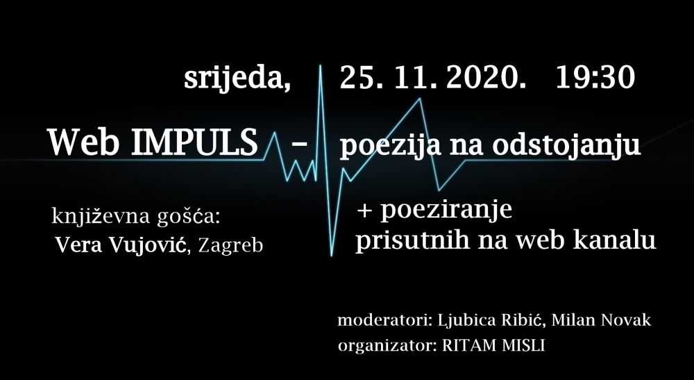 Udruga Ritam misli okuplja autore putem Web IMPULSA te organizira pjesnička druženja putem interneta. Posebna gošća WEB IMPULSA u studenom je književnica, članica Hrvatskog društva pisaca, Vera Vujović. Gledatelje i sudionike upoznat ćemo s izuzetnom autoricom i njenim stvaralaštvom, a ostali sudionici večeri predstavit će se pjesničkim radovima.