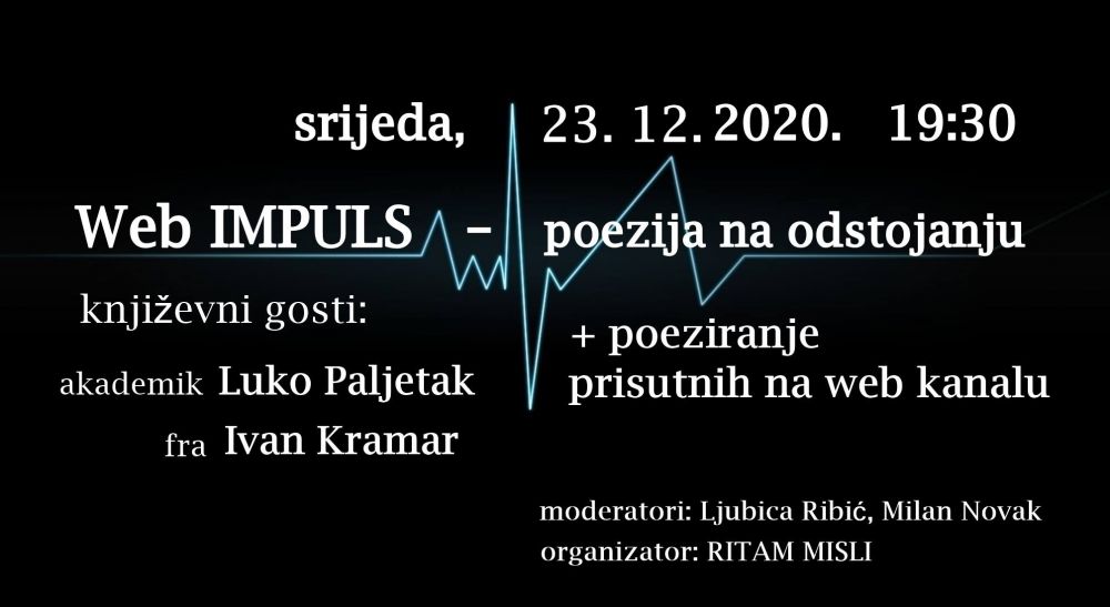Udruga Ritam misli vas poziva 23. prosinca s početkom u 19,30 na blagdanski „Web Impuls 8 – poezija na odstojanju“. U Web Impulsu 8 – poeziji na odstojanju glavni gosti su akademik Luko Paljetak i fra Ivan Kramar. Njihova poezija će svakako dodirnuti mnoge ljubitelje poetskog izričaja. Uz goste svoje stihove pročitati će i neki od prisutnih autora.