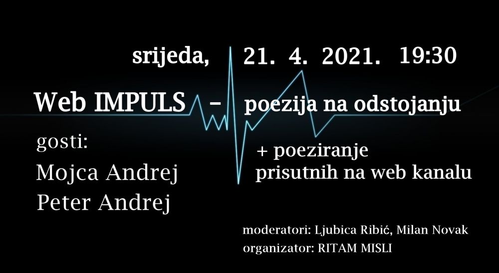 U srijedu, 21. travnja s početkom u 19,30 održat će se još jedno pjesničko druženje putem web-a. Pjesnici će svojom poezijom prenijeti ljepotu riječi i donijeti u naše domove tračak proljeća. Udruga Ritam misli vas poziva na praćenje preko Yu tube kanala. Dovoljno je da upišete Web Impuls 11 Ritam misli. Gosti 11. web Impulsa bit će pjesnički par iz Slovenije, spisateljica, pjesnikinja Mojca Andrej i kantautor Peter Andrej. Autori će nas svojom poezijom upoznati sa svojim pogledima na život i stvarnost koju živimo, te nas povesti na putovanje svojim malim, ali bogatim svemirima. Organizatori Ljubica Ribić i Milan Novak pozivaju sve pjesnike ili ljubitelje poezije na sudjelovanje u samom programu. Na Fb stranici IMPULS poezije otvoren je događaj na kojem se svi zainteresirani mogu prijaviti. Budimo dio proljetnog pjesničkog pulsiranja.