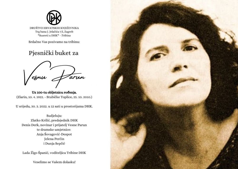 Tribina “Pjesnički buket za Vesnu Parun” održana je uz 100. obljetnicu rođenja pjesnikinje u Društvu hrvatskih književnika (DHK) održana je u srijedu, 30. ožujka na stoti rođendan velike hrvatske pjesnikinje.