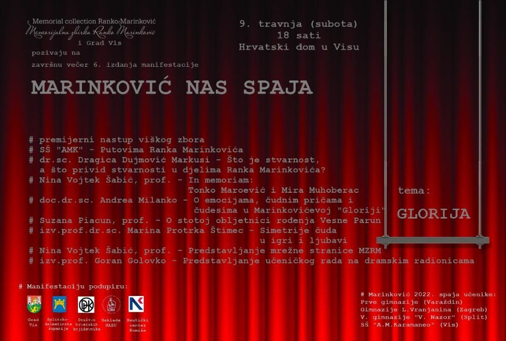 Marinkovićevo djelo spaja maturante iz Visa, Splita, Zagreba i Varaždina. Tema 6. kulturno-znanstvene manifestacije Marinković nas spaja u gradu Visu je Glorija.