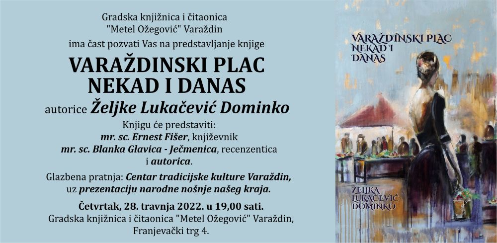 "Varaždinski plac nekad i danas" - naslov je knjige Željke Lukačević Dominko, koju će u četvrtak, 28. travnja, u 19 sati, u Gradskoj knjižnici i čitaonici "Metel Ožegović" u Varaždinu predstaviti mr.sc. Ernest Fišer i mr. sc. Blanka Glavica Ječmenica. Centar tradicijske kulture Varaždin predstavit će se u popratnom glazbenom programu uz prezentaciju nošnji varaždinskoga kraja.